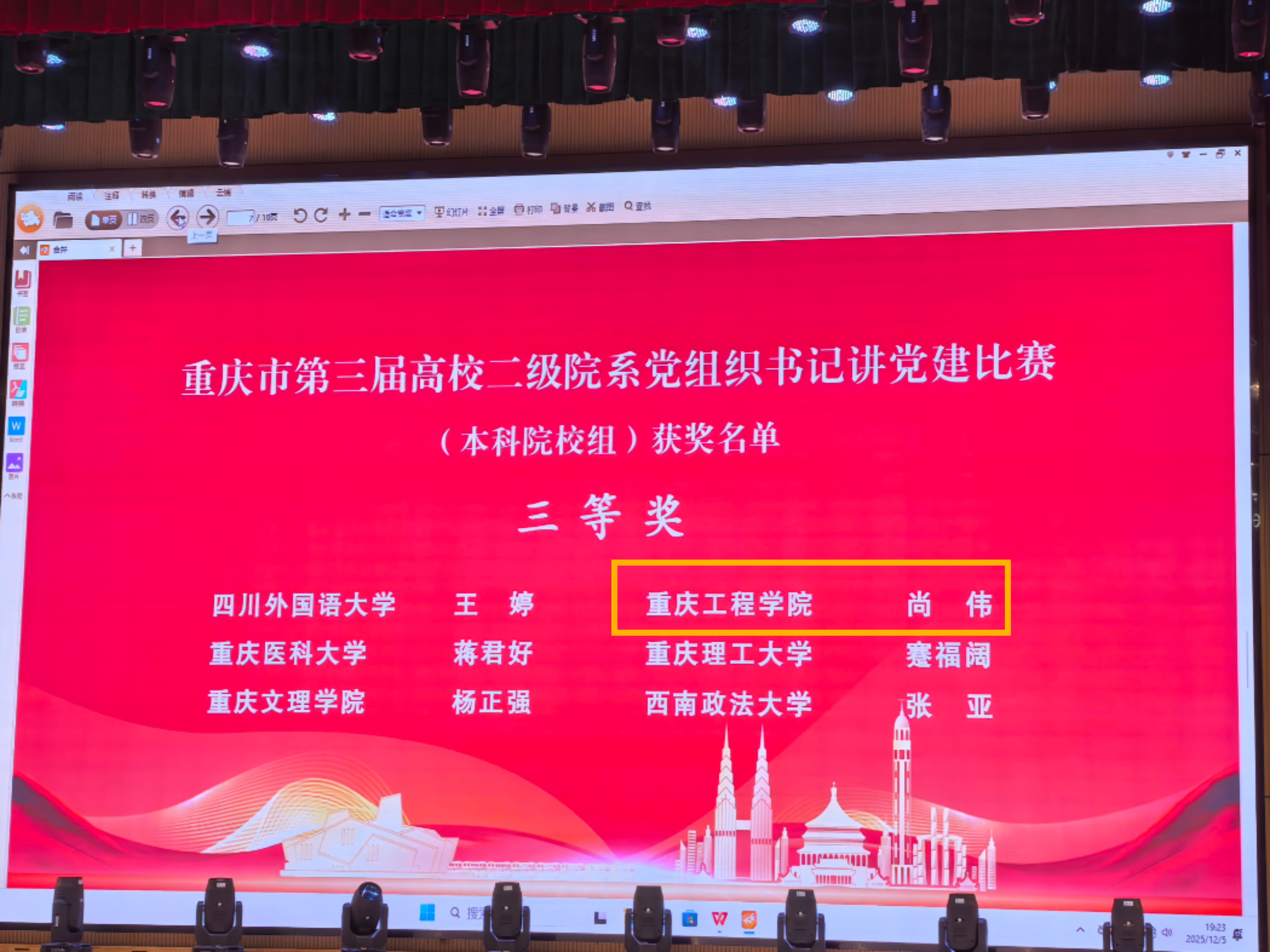 本网讯(图/文 马蒙)近日,由重庆市委教育工委主办的重庆市第三届高校二级院系党组织书记讲党建比赛成功举行,经过现场展示和现场问答两个环节的激烈角逐,我院党总支书记尚伟荣获本科院校组三等奖。