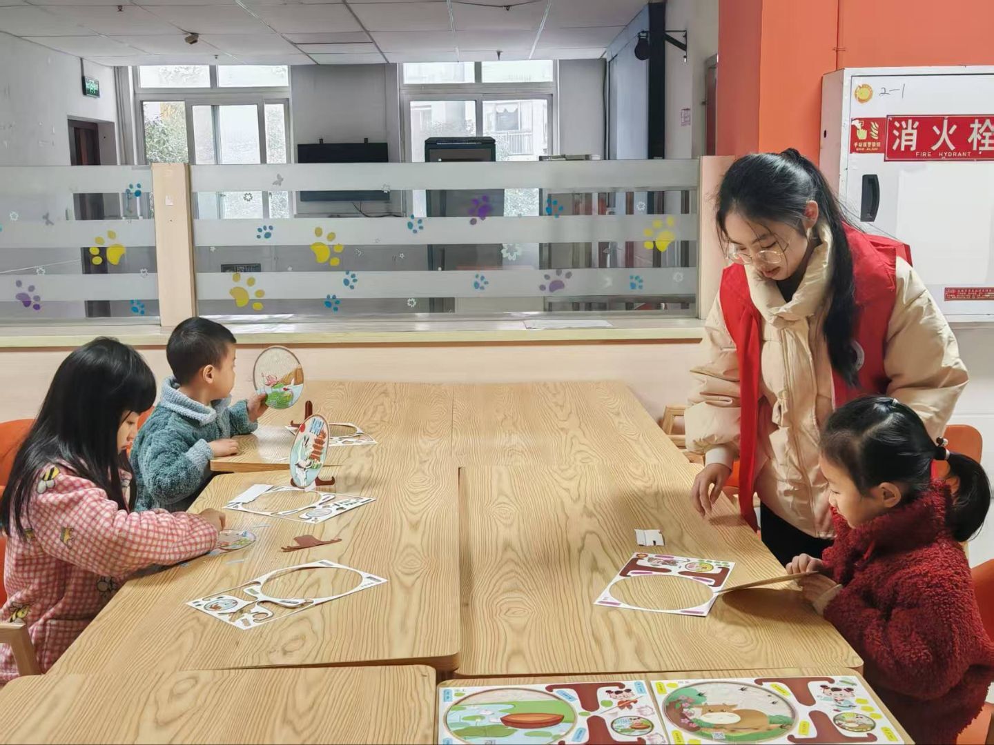 活动现场暖意融融,氛围热烈。学生志愿者以生动活泼的语言开篇,详细介绍了活动流程与核心意义,随后分享了多个通俗易懂的红色小故事——1936年,14岁的红军战士周广才随队三过草地断了粮,他献出缴获的皮带供战友充饥,还留下半截想带着去见毛主席。最终同班6名战友牺牲,他独自抵达延安,在皮带上烫下“长征记”以作缅怀 。从革命先辈的奋斗历程到身边的榜样事迹,一个个鲜活的案例点燃了小朋友们的参与热情,也让红色精神在轻松的氛围中埋下种子。紧接着,志愿者们有序为孩子们发放竹筛、颜料、画笔等创作材料,并耐心讲解绘画技巧与安全注意事项,鼓励大家大胆发挥想象。孩子们或独自构思或分组协作,在竹筛上勾勒诗词,创作完成后,小朋友们逐一展示作品,在互动交流中深化对诗词文化的理解。