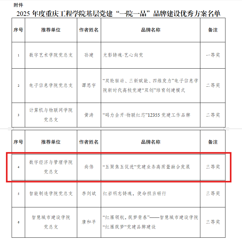 本网讯(文/图 章鑫 学生党教中心)近日,我院党总支书记尚伟在2025年度重庆工程学院基层党建“一院一品”品牌建设优秀方案评选活动中,报送的的品牌方案《 “ 五聚焦五促进”党建业务高质量融合发展 》荣获三等奖。