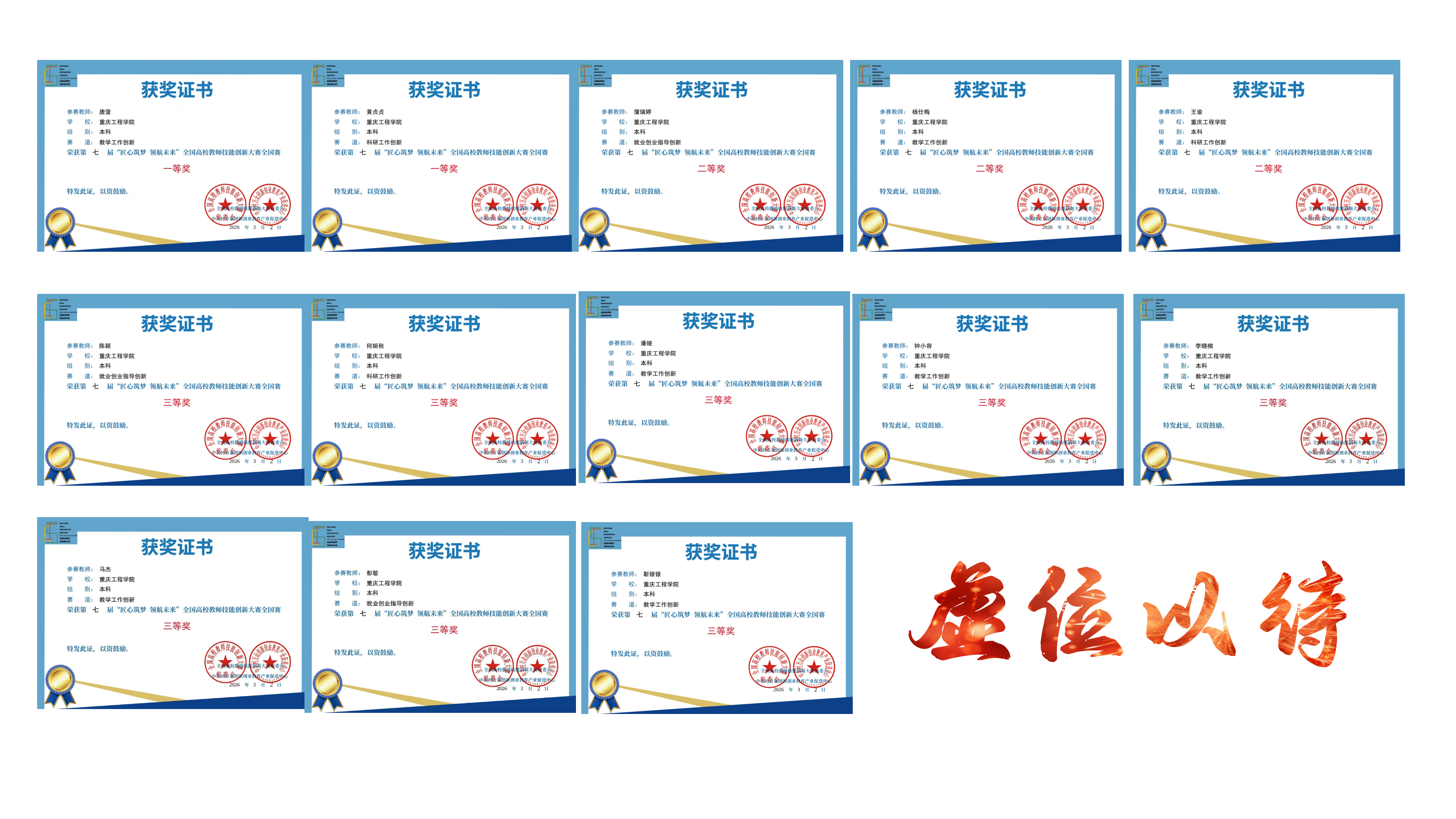 本网讯(图/文 张金波)近日,第七届“匠心筑梦 领航未来”全国高校教师技能创新大赛复赛成绩正式发布。本次大赛规模宏大、覆盖面广,全国共有904所高校的4014位选手成功晋级全国赛,经过全国赛初赛、复赛的层层选拔与严格评审,最终来自全国687所高校的2717位选手脱颖而出,分别荣获全国赛一、二、三等奖,其中一等奖415人、二等奖952人、三等奖1350人。