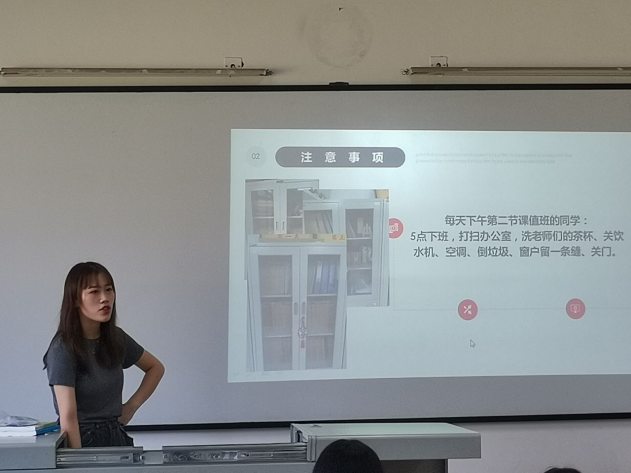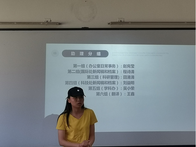 在培训过程中,赵婉莹同学首先给大家介绍了部门的老师以及老助理们;其次是助理需要做的一些日常事务、注意事项、以及近期的工作安排;最后就是介绍了一下部门里的三个版块6个小组的主要工作内容,每个组都有一个负责人进行带领,新助理根据需要选择进入版块。