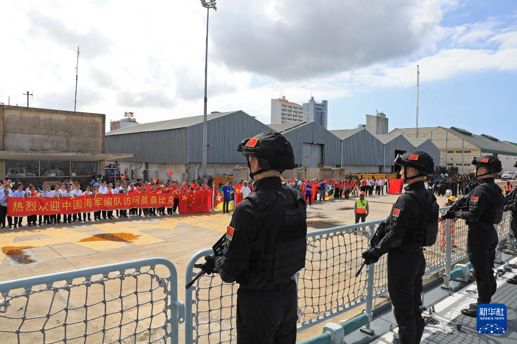 欢迎仪式上,莫桑比克军乐队奏响中莫两国国歌,组织当地特色舞蹈表演。欢迎人群挥动着中莫两国国旗,拉起欢迎横幅迎接编队的到来。仪式结束后,欢迎人群分批次登舰参观。