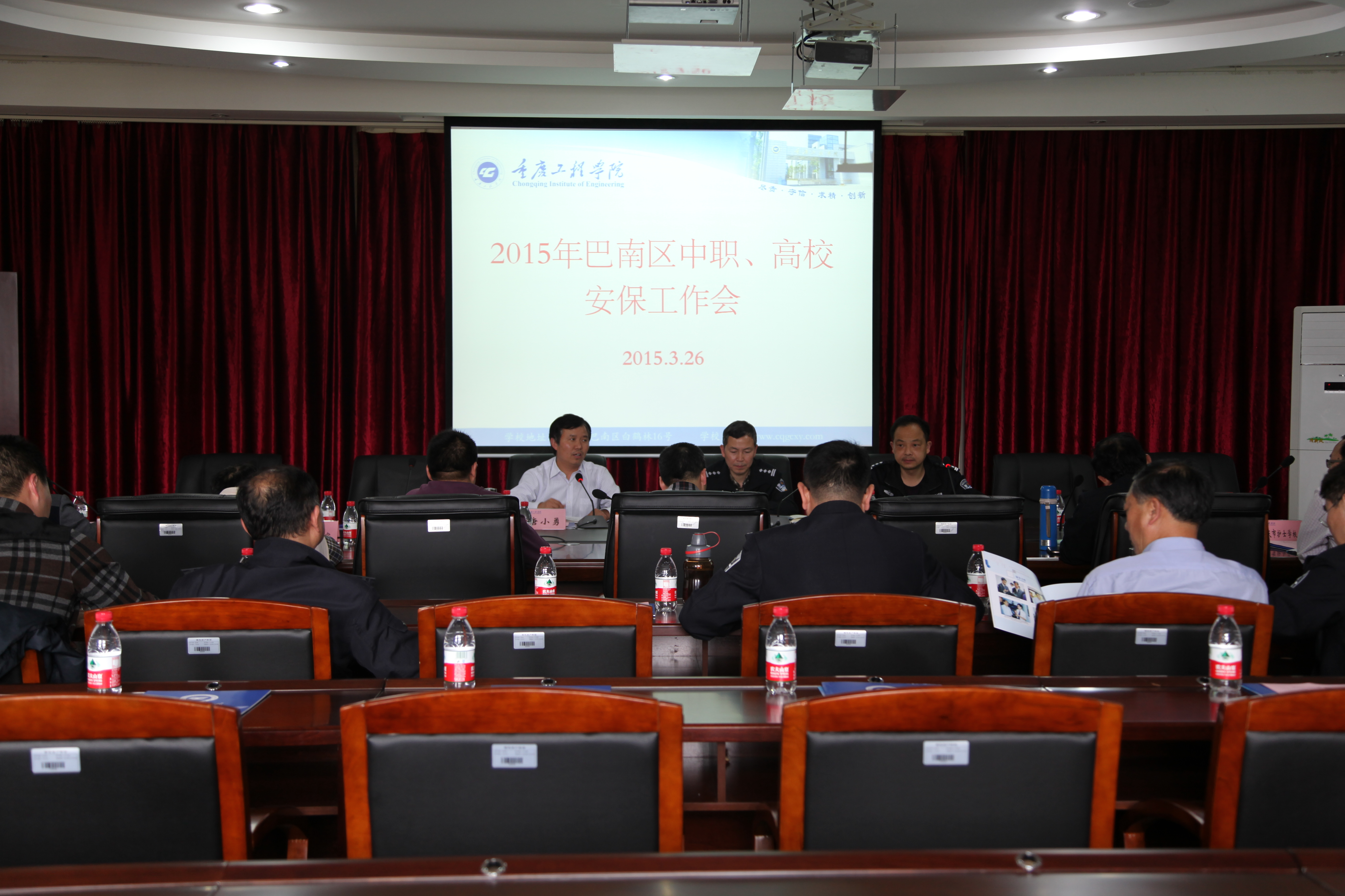 本网讯(保卫处)2015年3月26日,巴南区中职、高校安保工作在我校召开,会议由区校保支队副支队长谢全力主持,参会人员有区校保支队政委吴苹、副支队长陈兴全,学校校长助理唐小勇和巴南区所有中职、高校分管安全的校领导、保卫处长、驻校民警。 会议开始前由我校校长助理唐小勇致欢迎词,会议中所有参会中职、高校分别就本校安全工作进行了经验交流发言,我校由保卫处长程国园就如何防骗、防盗及安全宣传等进行了经验交流发言。