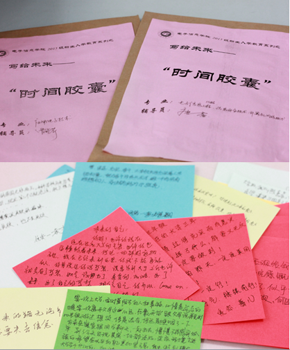 所有新生写下自己的学习目标及梦想,并装入档案袋内。电子信息学院书记刘子菱表示,这个学生个人梦想档案袋会在他们毕业时,由学生本人拆开。让学生自己回顾自己的校园生活,用“时间胶囊”的穿梭来证明学生的自我目标树立性。