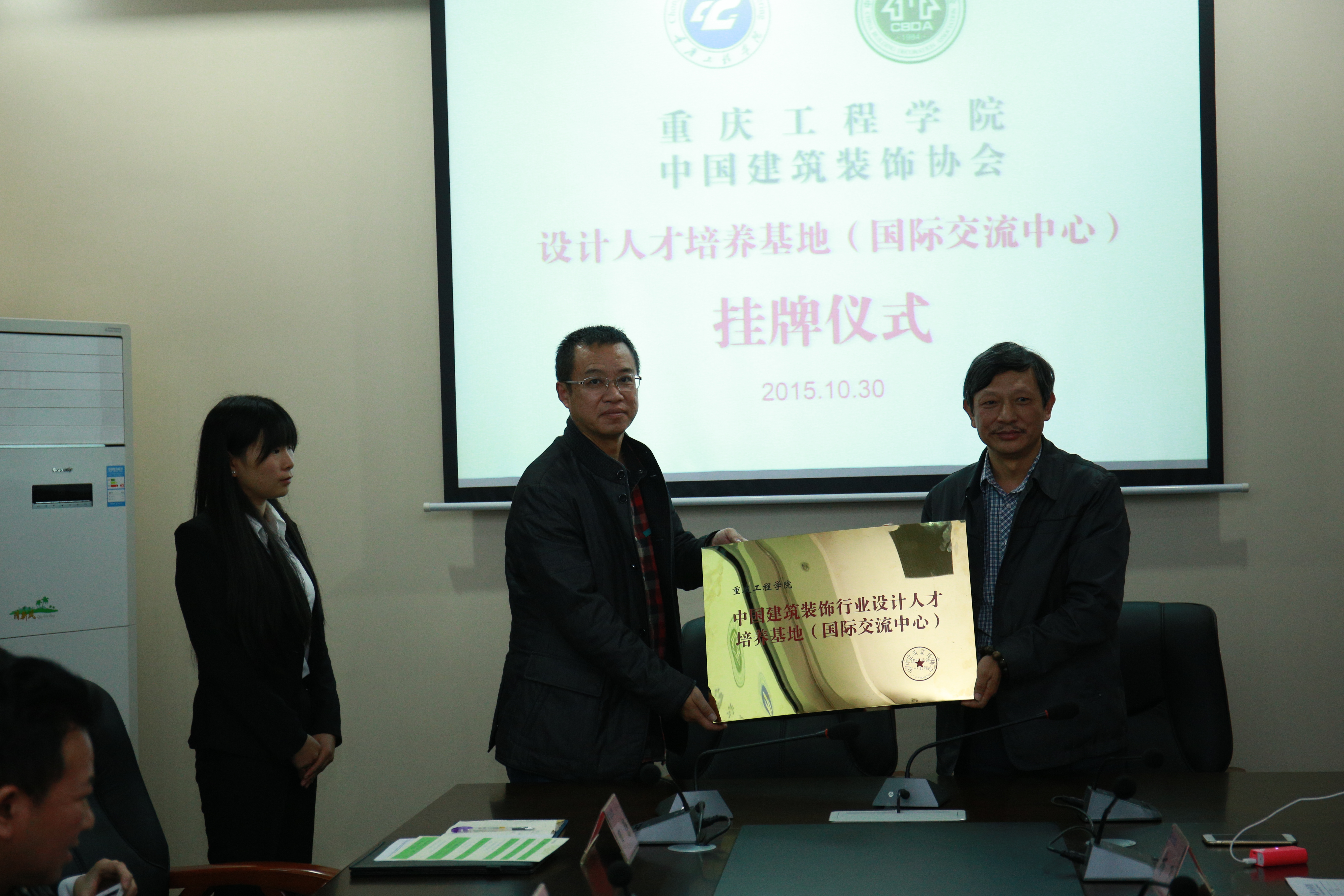 本网讯(国际合作处)2015年10月30日下午,中国建筑装饰协会领导及嘉宾莅临重庆工程学院。在我校行政楼第二会议室,重庆工程学院与中国建筑装饰协会联合举行了“重庆工程学院实习实训共建合作单位”和“中国建筑装饰行业设计人才培养基地(国际交流中心)”挂牌仪式。