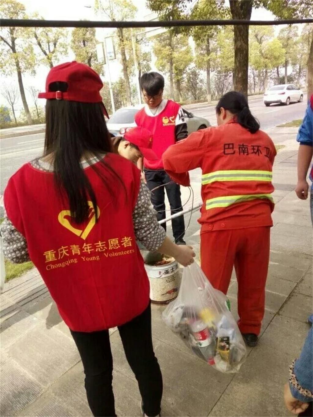 本网讯(校团委 黄涛)为弘扬雷锋精神,更好的建设大美巴南。3月27日,我校青年志愿者与我校结对共建社区市民学校志愿者代表在巴南区巴滨路联合举行“赏巴南之美,思环卫之辛”主题活动。志愿者们利用自己勤工俭学所得,为部分环卫工人购买口罩和白手套,感恩环卫工人的辛勤付出——“劳动者是最美的人”。23名志愿者和环卫工人们一同清扫巴滨路多条道路两侧绿化带内杂物、零散垃圾,并集中清理集存垃圾。