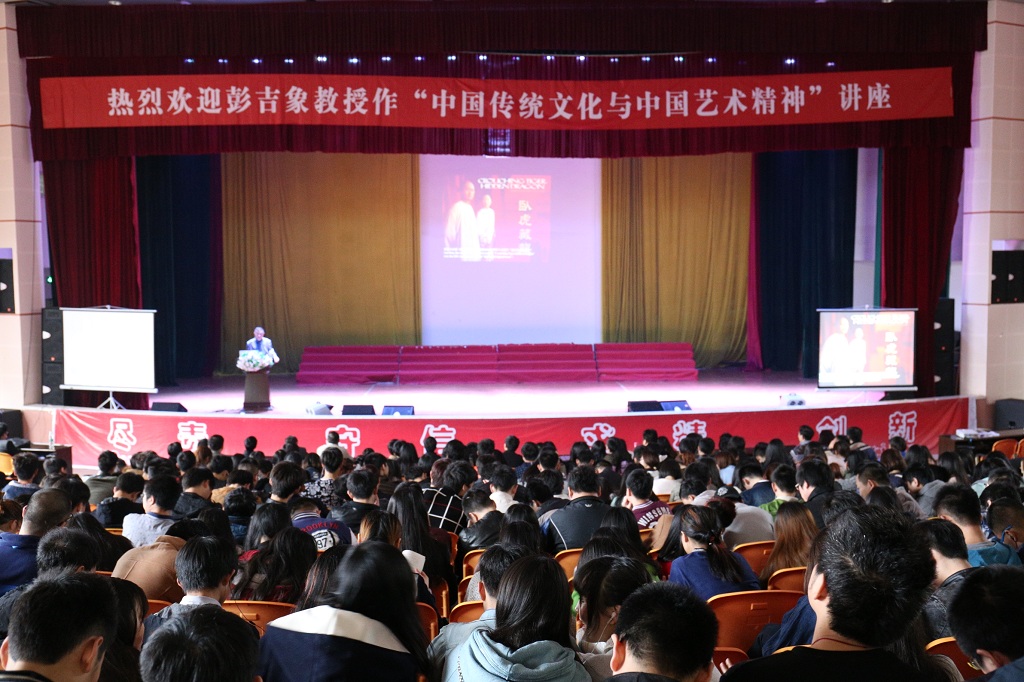 彭吉象教授在讲座中,用详实的图片、精妙的语言、激情的投入与大家一起分享“中国传统文化与中国艺术精神”,分别从绘画、建筑、舞蹈、音乐、电影、北京奥运会开闭幕式,2012年作家莫言获得诺贝尔奖等七个方面解读当代艺术——“用最现代的艺术语言去表现优秀传统文化”,并指出中国艺术所体现出来的浓浓中华传统文化精髓、精神。此外,他认为,中国传统美学强调的是表现、抒情、言志,而西方强调的是再现、模仿、写实”,其深入浅出的分析中西文化异同,现场不时掌声雷动,师生大呼过瘾。