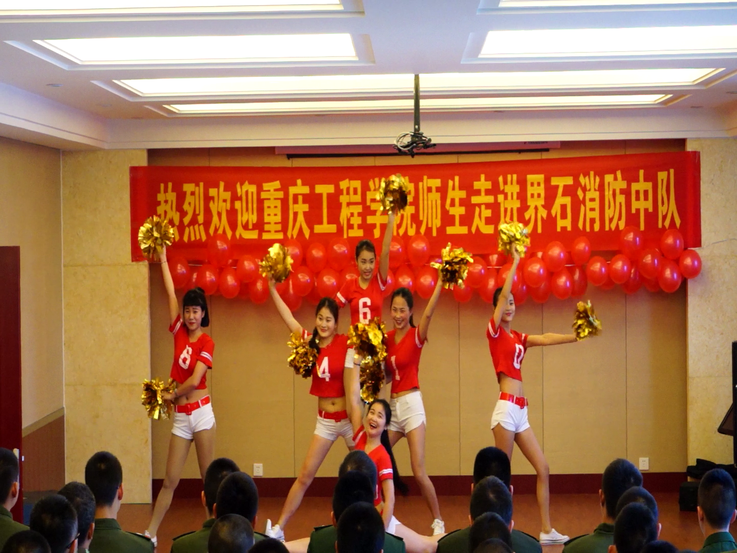 下午三点整,表演在巴南区界石消防中队报告厅隆重举行,演出在啦啦操《Push push》中拉开序幕,新颖的编排与表演展现了力和美的结合。原创朗诵《消防战士之美》深情讴歌了人民消防人民爱、人民消防爱人民的鱼水深情,令在场官兵为之动容。歌曲串烧《只知道你是消防兵》、韩舞《Suger》、古典舞《年轮》、爵士舞《Deepend》等精彩的节目将演出推向高潮,不时赢得阵阵掌声。演出在师生与消防官兵合唱的《橄榄树》歌声中结束。