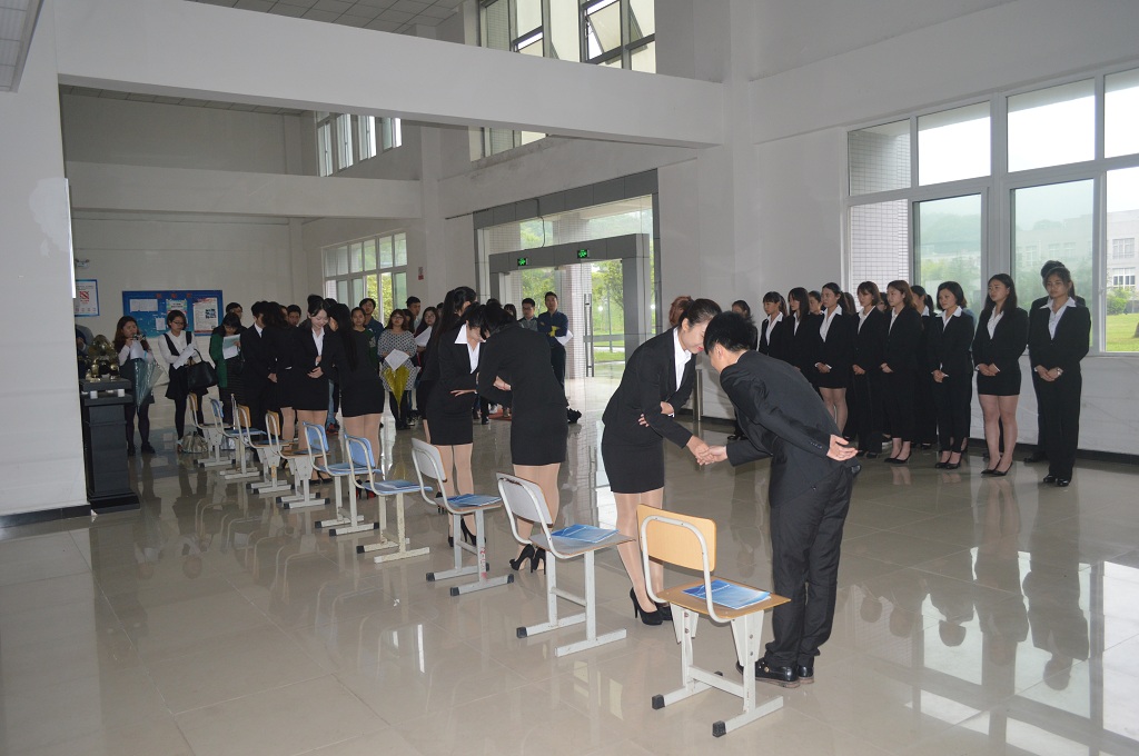 2016年4月12日,第二课堂素质教育示范课在六教一楼大厅拉开序幕,管理学院1502801、1502802班同学在辅导员石丹的组织下向大家献上了一堂精彩的德能修养课——《商务礼仪》。