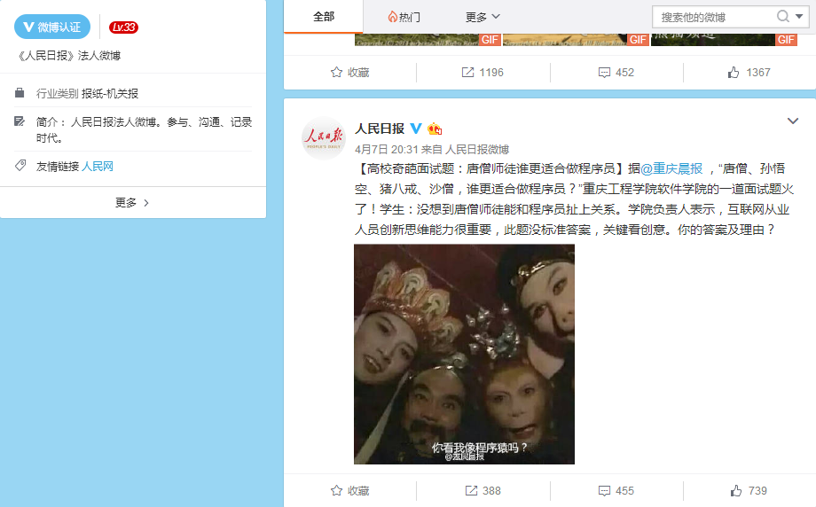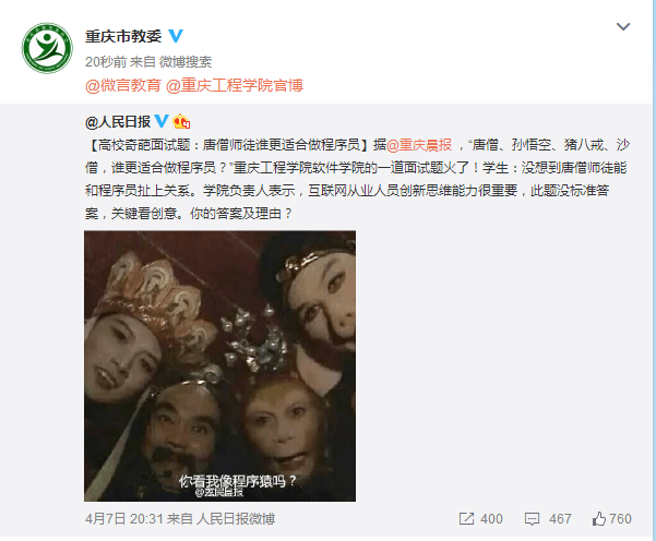 本网讯(党委宣传部)据@重庆晨报,“唐僧、孙悟空、猪八戒、沙僧,谁更适合做程序员?”重庆工程学院软件学院的一道面试题火了!学生:没想到唐僧师徒能和程序员扯上关系。学院负责人表示,互联网从业人员创新思维能力很重要,此题没标准答案,关键看创意。你的答案及理由?——并喜获人民日报、中国新闻网、中国网、网易、重庆市教委等官博、门户网站的转载报道。