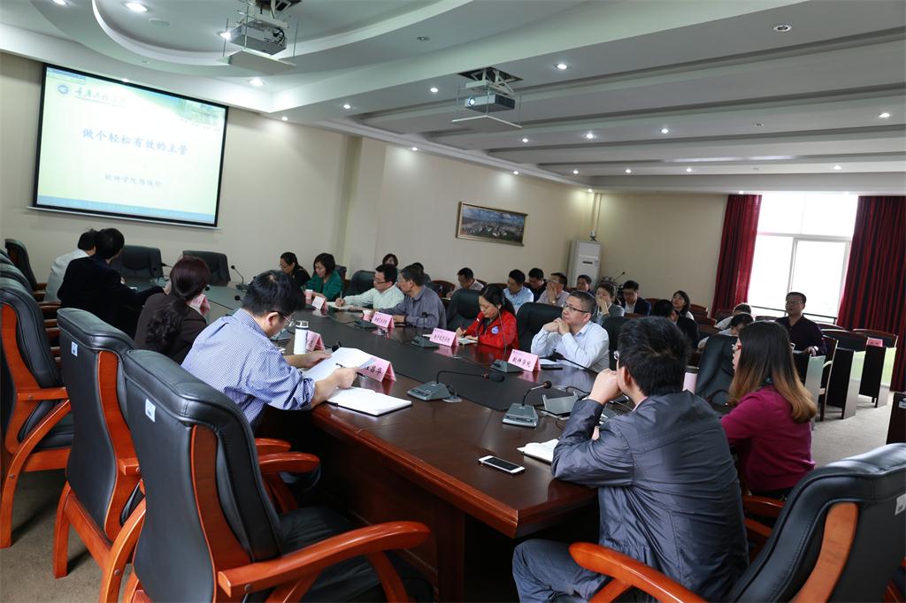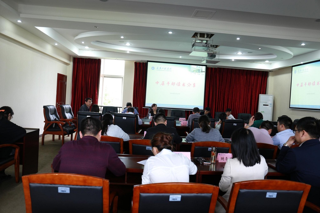 本网讯(人事处 赵鹏涛)为增进学习力,提升竞争力,促进中层干部“爱读书、会读书、读好书”的行为习惯,进而引领全体教职工读书学习的浓厚氛围,推进学习型校园建设,去年秋季以来学校要求中层干部利用空暇时刻、寒假时间购书、读书,并撰写读书心得体会。为此,4月29日上午九时,人事处在行政楼二会议室特组织开展了中层干部读书分享交流会,检验学习成果。学校副校长程昌华、副校长王琼花、副书记盛友兴、校长助理唐小勇出席了读书分享会。