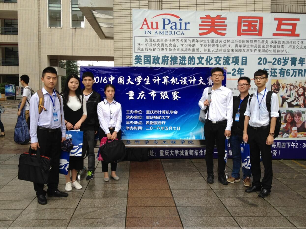 本网讯(软件学院)5月7日,2016年中国大学生计算机设计大赛(重庆市级赛)在重庆师范大学大学城校区举行。本次大赛共有来自重庆大学、西南大学、重庆工程学院等16所高校143支队伍参赛。我校派出的以软件学院学生为主体的7支学生代表队表现优异,最终取得3个二等奖,2个三等奖,为我校赢得了荣誉。