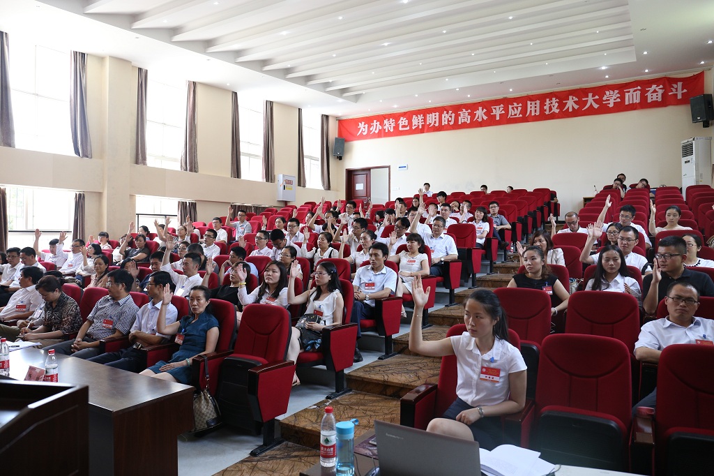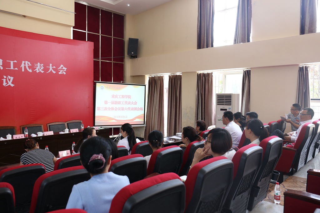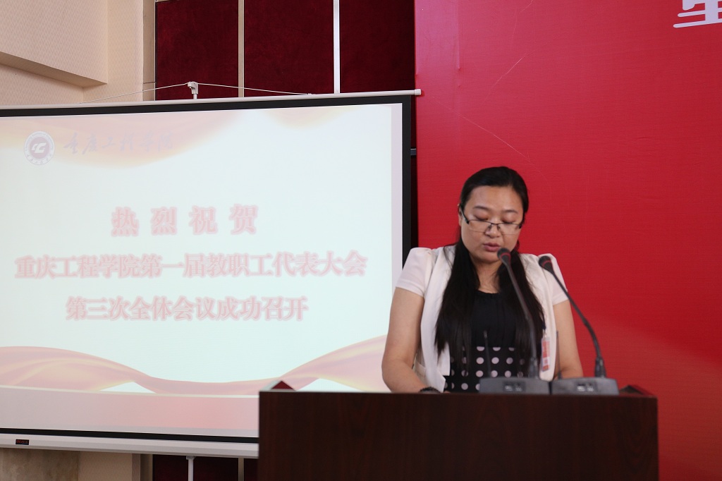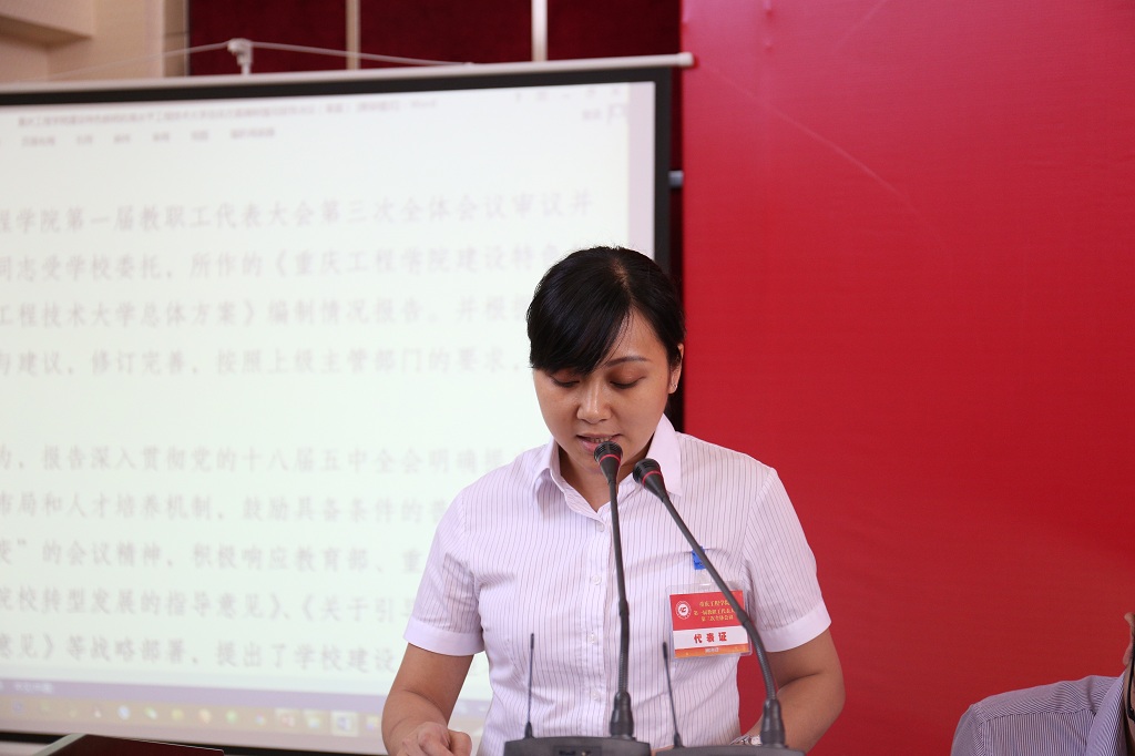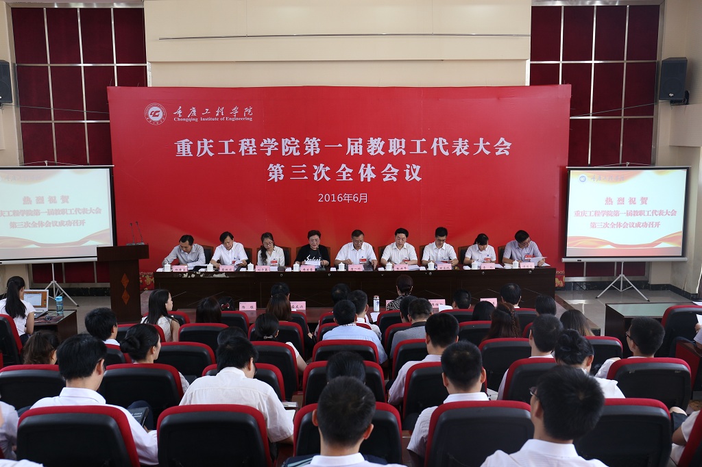 节日的阶梯报告厅简朴而庄重,气氛严肃而热烈。主席台上方悬挂着“重庆工程学院第一届教职工代表大会第三次全体会议”大字,主席台正对面“办特色鲜明的高水平工程技术大学”的标语格外醒目。随着时间的临近,代表们精神饱满、劲头十足地陆续步入会场。校长唐一科、党委书记兼常务副校长张业平、纪委书记兼工会主席冉启蓉,以及刘子菱、李玲、蔡跃宏、谭思宇、郑孝宗等老师在主席台前就坐。非大会正式代表的其他校级领导、中层领导干部列席大会,大会还特邀民主党派代表、区政协委员等共襄盛会。