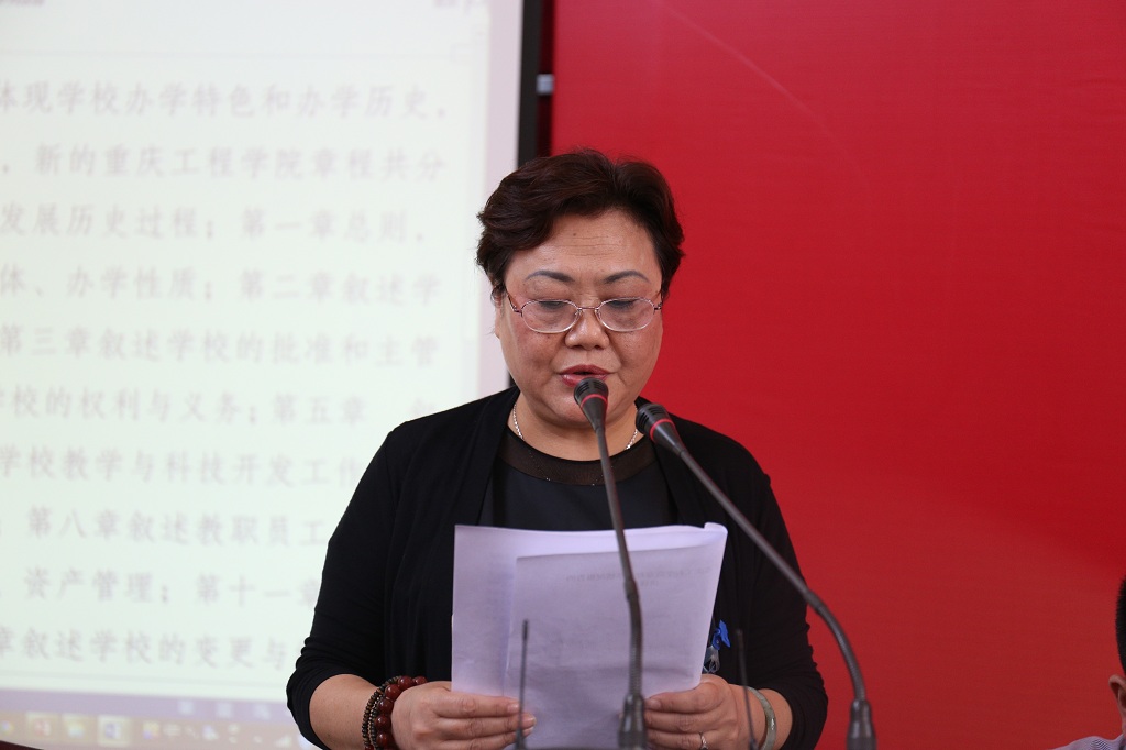 主席团成员李玲宣读《关于建设特色鲜明的高水平工程技术大学总体方案》编制情况报告的决议。