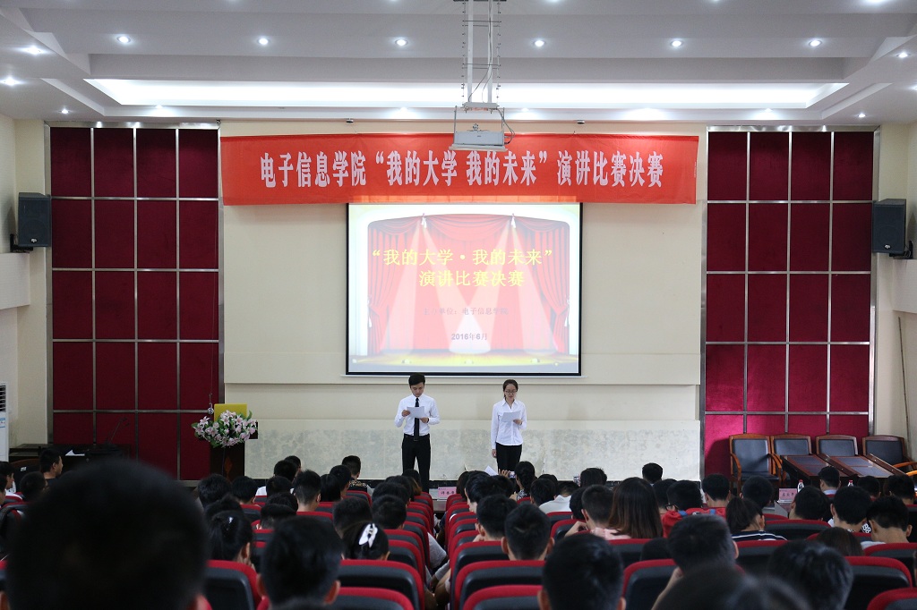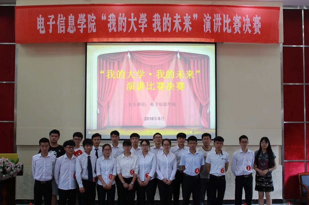 本网讯(电子信息学院 刘顺江)增强在校学生的语言表达能力,提升同学们的演讲水平,既是我校开展第二课堂的重要内容,又是综合素质拓展的实招,电子信息学院于6月20日在行政楼报告厅举行了“我的大学,我的未来”主题演讲比赛决赛,以检验素质教育开展效果。经过初赛选拔出的十三位优秀选手参加决赛,带着对大学生活的热爱,未来美好生活的憧憬,情真意切地为在场180名师生送上了一场听觉的盛宴。本次比赛邀请特素质教育中心副主任黄燕老师,校团委副书记黄涛老师担任嘉宾,各学院老师代表、学生干部代表共同担任评委。