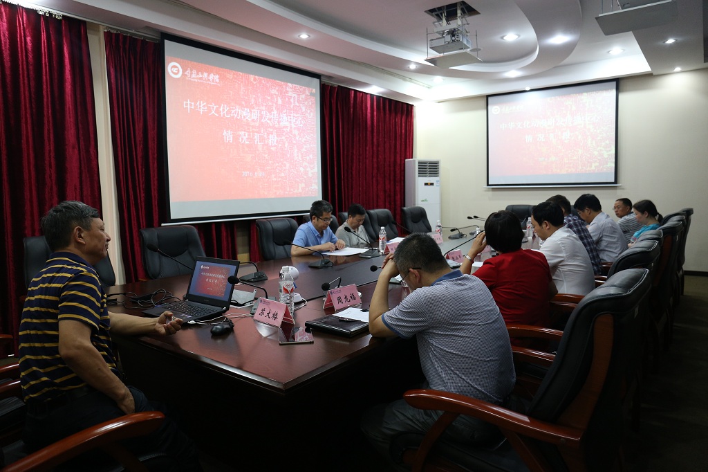 会上,唐一科校长首先介绍了我校的发展情况,传媒艺术学院苏大椿校长就中心的工作情况进行了汇报,对已完成的相关系列动画进行了展示,并进行了配套游戏体验。