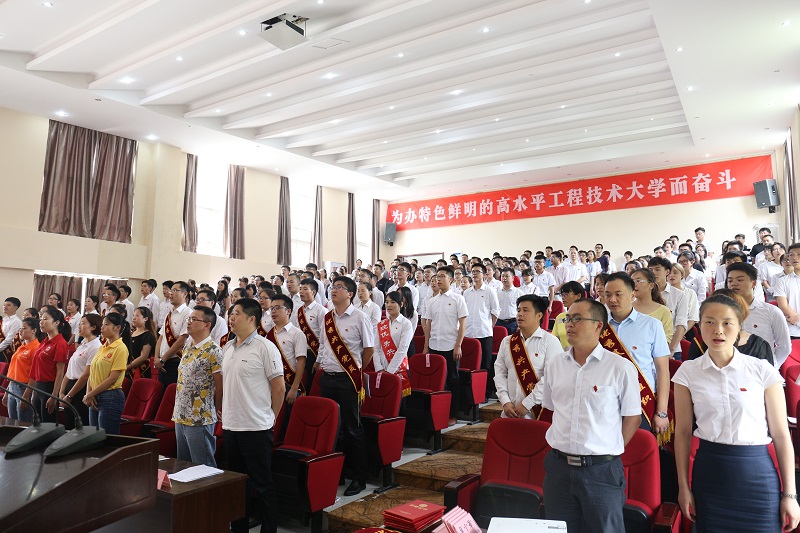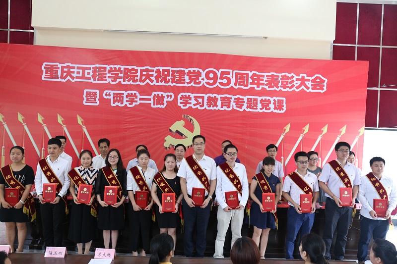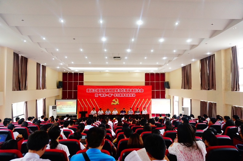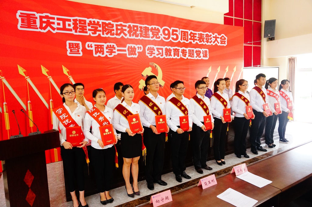 节日的阶梯报告厅气氛庄重而热烈。主席台上方悬挂着“重庆工程学院庆祝中国共产党成立95周年表彰大会”十分醒目,十面红旗分列两侧,正中是熠熠生辉的中国共产党党徽。下午13:30分,党委组织部部长甘永诚宣布庆祝表彰大会开始,全场起立高唱中华人民共和国国歌。