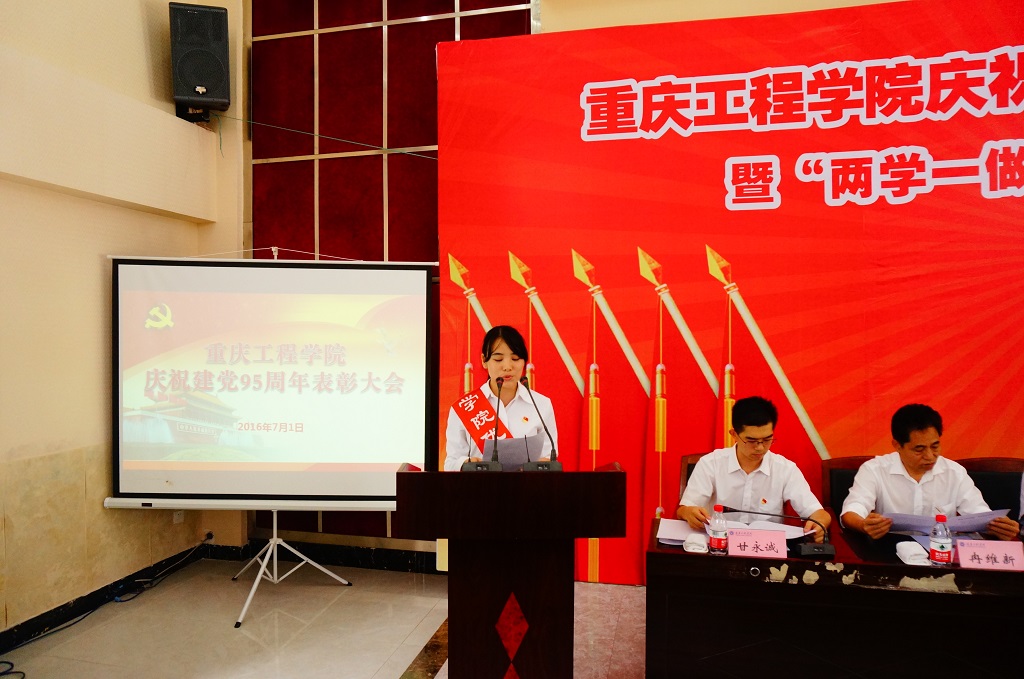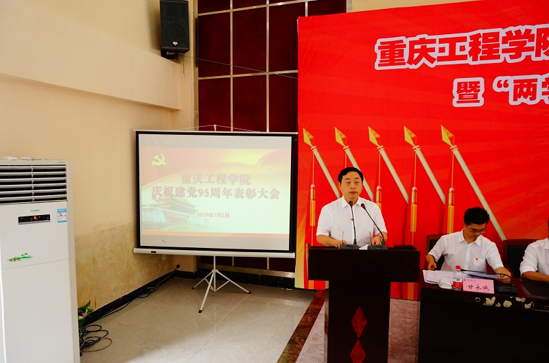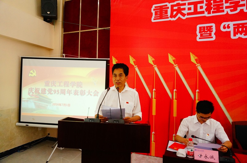 本网讯(党政办\党委宣传部)重庆工程学院庆祝中国共产党成立95周年表彰大会暨“两学一做”学习教育专题党课,7月1日下午,在阶梯报告厅隆重举行。党委委员、教产公司副总经理谭其贵,校长唐一科,党委书记张业平,党委副书记盛友兴、冉维新,纪委书记兼工会主席冉启蓉,党委委员、校长助理唐小勇出席大会并在主席台就坐。