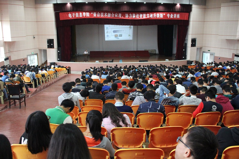 本网讯(电子信息学院 曹晓芹)为了让同学们更好的了解智慧交通, 10月12日下午,电子信息学院特邀国家智能运输系统标准化技术委员会委员、国家大数据标准化工作组成员、电子信息学院特聘专家任建卫教授,在学术报告厅做了主题为“整合技术融合应用,协力推进智慧交通升级版”的专业讲座。电子信息学院领导、部分专业老师、全体辅导员和1000余名学生参加了此次讲座。