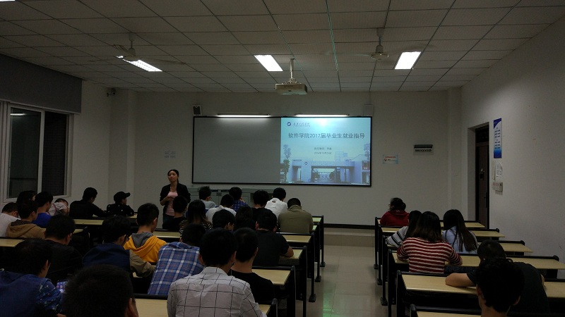 本网讯(软件学院 李霜) 为了积极应对2017届毕业生就业形势,贯彻落实学校关于2017届毕业生就业创业工作的总体安排和部署,2016年10月23日18:20,软件学院辅导员李霜对所带班级开展了就业指导会,总计73名学生参加。