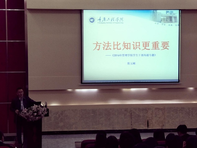 本网讯(管理学院 陈娟)2016年11月3日18:30在行政楼阶梯报告厅隆重举行了关于“方式比知识更重要”的培训讲座,这是管理学院2016年针对管理学院学生会干部培训工程的主要内容之一。本次培训的主讲人是管理学院院长简玉刚,由管理学院学工主任杨军老师主持,以及管理学院178名学生干部参加。