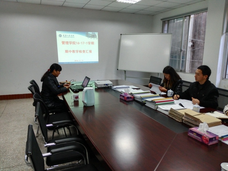 本网讯(管理学院 陈娟) 为切实加强教学管理和教学质量监控,规范教学行为,全面掌握本学期开学以来的教学整体状况,及时发现并解决教学过程中存在的问题。根据“重庆工程学院关于2016~2017学年第一学期期中教学检查的通知”相关要求,11月11日15:00,职评办主任袁开友、软件学院副院长陈俟伶、电子信息学院副院长景兴红、传媒艺术学院副院长庄涛文、教务处赵友贵科长、职评办胡娟老师等莅临管理学院进行16-17-1学期期中教学检查。