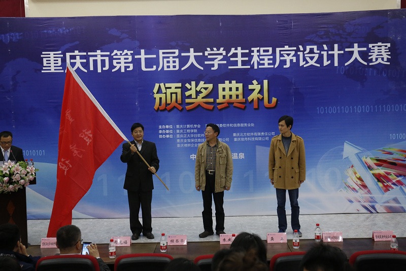 赛后,重庆市计算机学会理事长朱庆生、重庆工程学院副校长程昌华教授等领导及嘉宾出席了大赛颁奖典礼。程昌华教授为本次程序大赛致辞,并与朱庆生理事长、重庆工商职业技术学院龚卫教授一同完成了赛旗交接仪式。