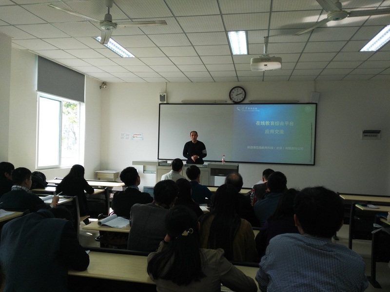 本网讯(管理学院 陈娟) 为了方便教师在网络教学平台积极开展教育教学活动,使我校网络教学与课堂教学相互渗透,拓展师生教与学的空间,从而深化教学手段、教学方法、教学模式的改革,进一步提高课堂教学质量和效率,管理学院于2016年11月18日下午在六教111教室召开了网络教学平台使用培训会议,本次培训由信息中心主任皮小军主持,清华教育在线的孙老师主讲,管理学院全院教师参加了此次培训。
