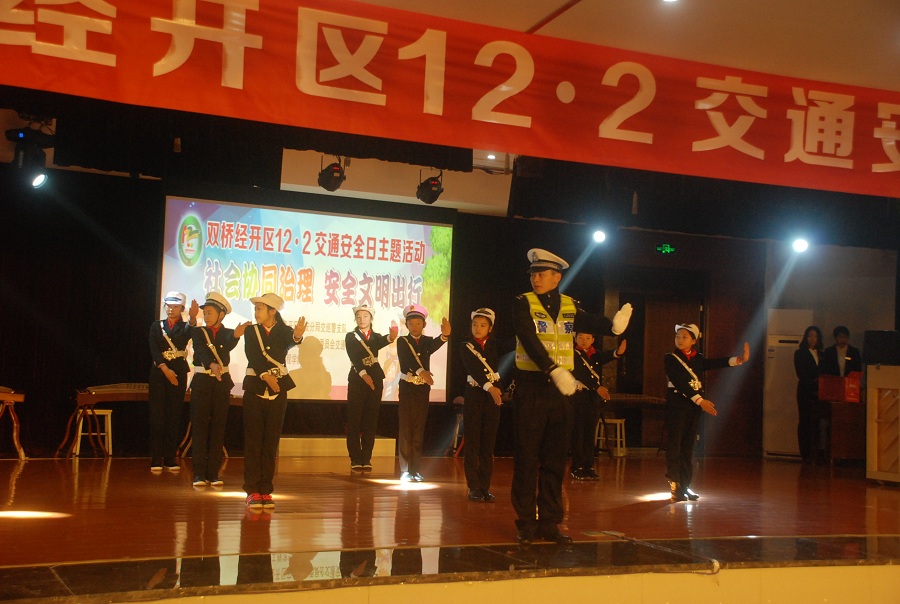 “社会协同治理,安全文明出行”是今年交通安全日的主题,围绕主题蒋小波同志致辞并向大家发出倡议。活动期间,我校学生表演的活力啦啦操,古典艺术展示等,向大家展示我们精彩丰富的校园生活。为了使交通安全思想铭记于心,活动还进行了你做我猜的游戏环节,交通警察示范手势指挥,活跃了气氛的同时也起了一定的教导作用。期间,双桥经开区双路二小少年交警来带手势表演,赢得在场观众阵阵掌声。