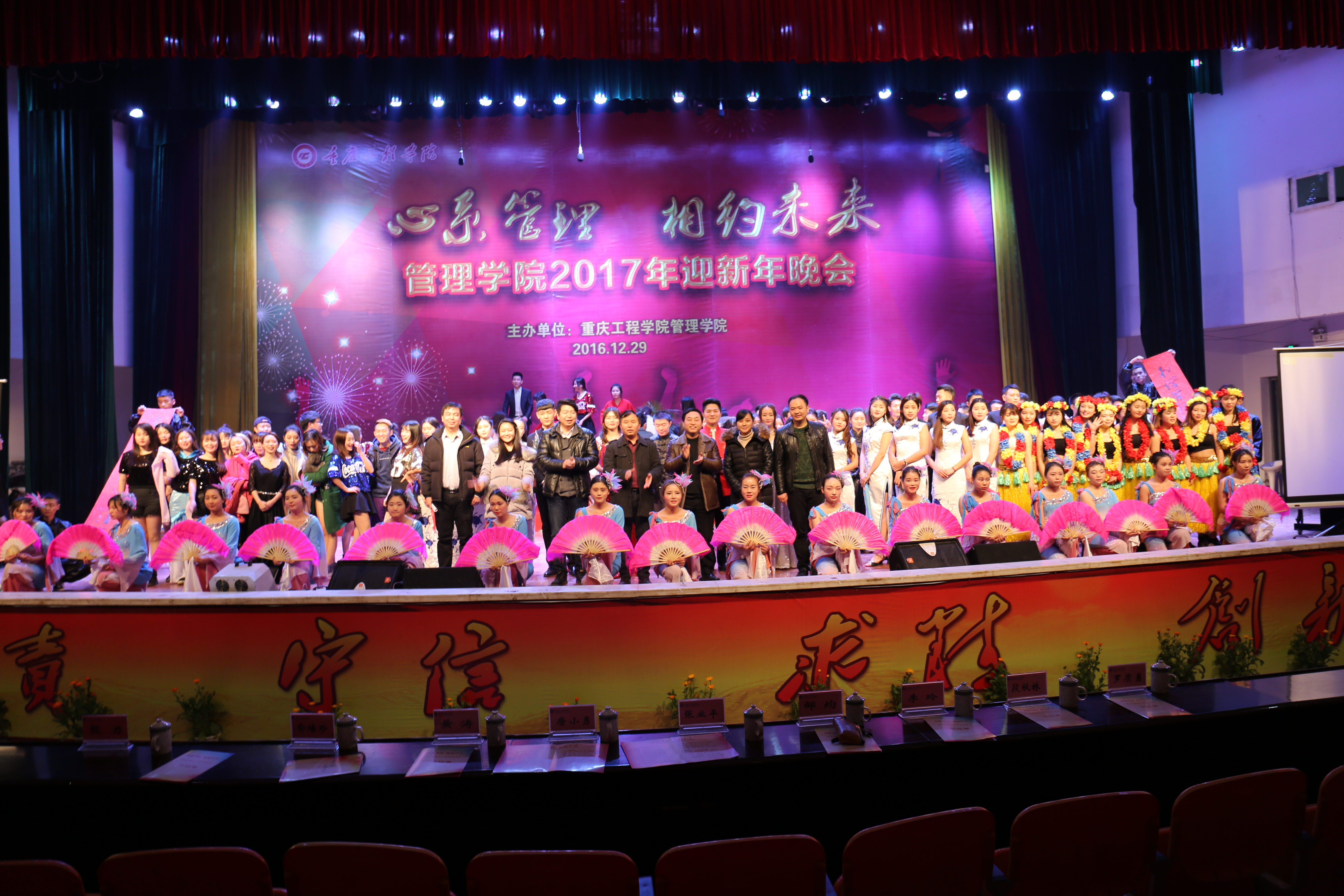 本网讯(管理学院)12月29日晚18:30,“心系管理 相约未来——管理学院2017年迎新年晚会”在学校学术报告厅成功举行。重庆工程学院党委书记张业平、校长助理唐小勇、学工部部长邹均、校宣传部副部长黄涛、就业中心主任罗质勇、校团委副书记俞培珍、管理学院副院长李玲、管理学院党总支书记熊力以及管理学院部分老师出席了晚会,此次晚会由管理学院主办。