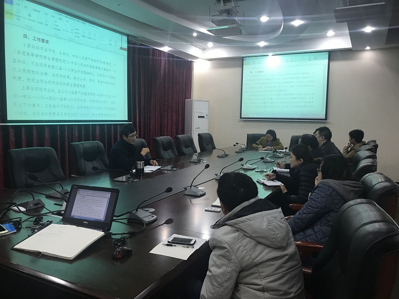 本网讯(学生处 罗桓)2017年3月14日上午9:30,我校在学校第二会议室组织召开了学生管理制度修订工作部署会。会议由学生处处长邹均主持,学校党委副书记盛友兴出席会议,教务处、财务处、招生就业处、图书馆、保卫处、后勤处、团委、素质教育中心及信息中心等相关部门负责人参加会议。