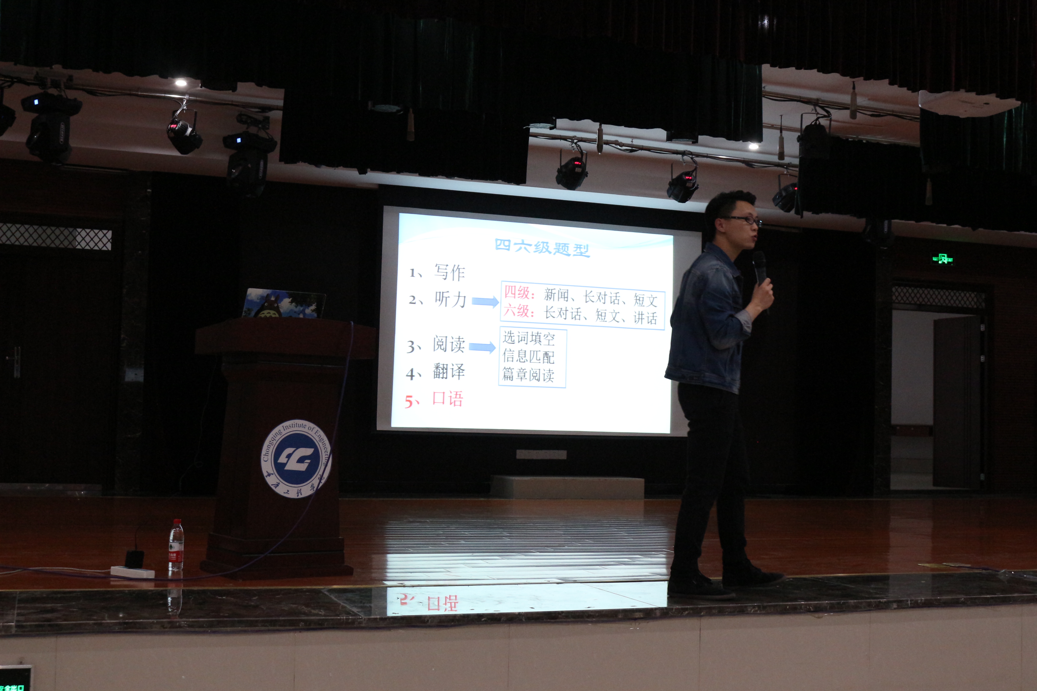 汤老师从英语四级考试中的听力、阅读理解、写作和翻译四个题型出发,为同学们讲解了英语四级考试的试卷构成和相应的答题技巧。