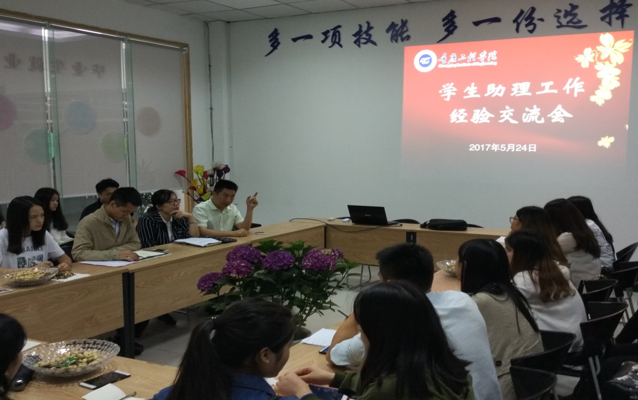 本网讯(学生处 黄燕)5月24日下午18:30,我校在大学生服务中心1-3室组织召开了2016-2017学年度第二学期学生助理工作经验交流会。学工部部长邹均、大学生素质教育中心副主任黄燕及30余名学生助理代表参加了会议。