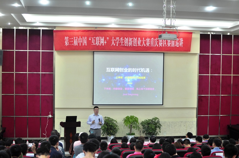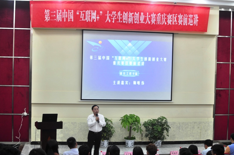 本网讯(招生就业处 熊佳)为充分发挥“互联网+”大学生创新创业大赛平台作用,调动我校师生积极参与大赛的热情,有效实现“以赛促教、以赛促学、以赛促创、以赛促改”目的,2017年5月9日,第三届“互联网+”大学生创新创业大赛校内巡讲重庆工程学院站在校办公楼阶梯教室隆重举行。全校各二级学院领导、指导教师、学生代表共计300余人参加了讲座。