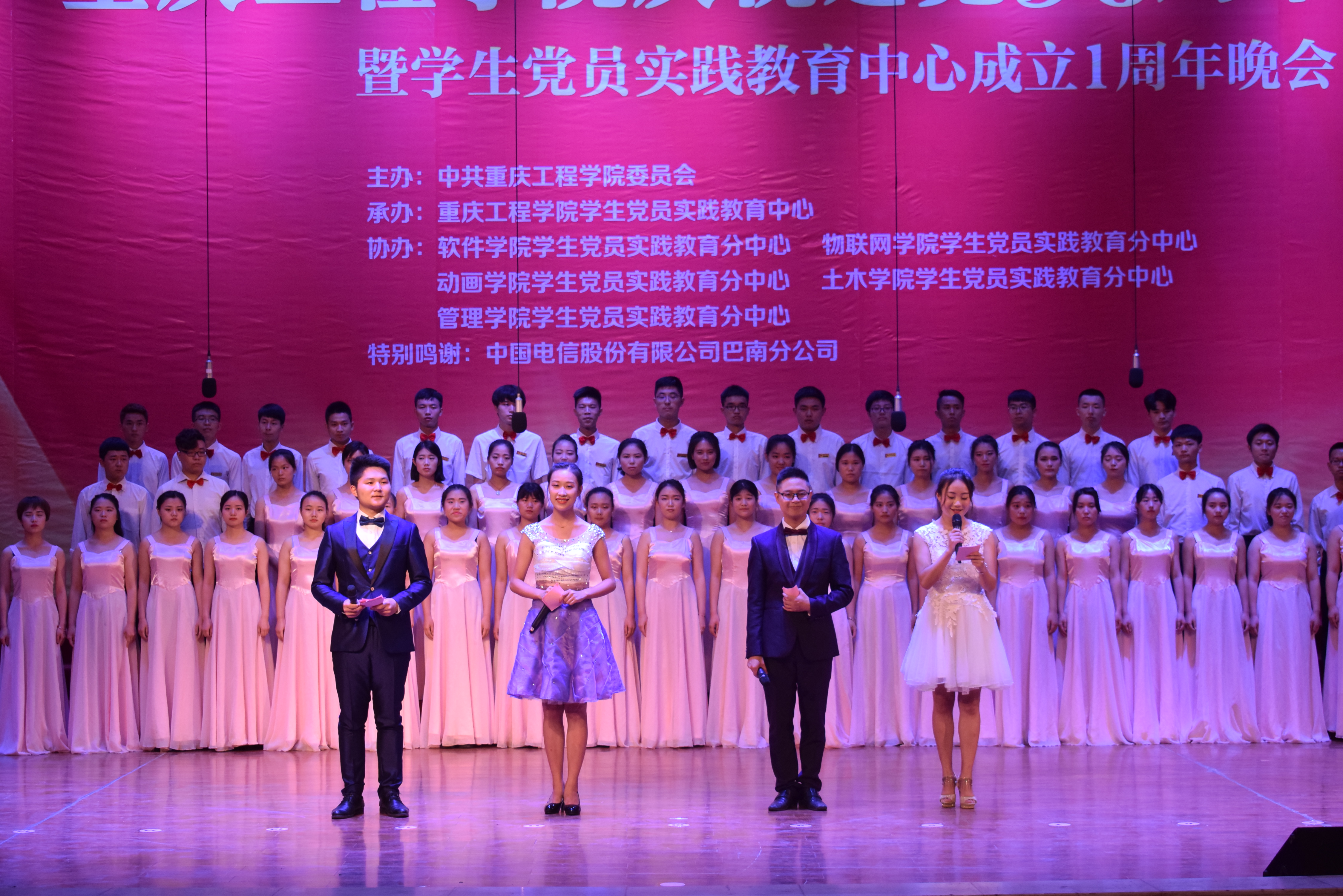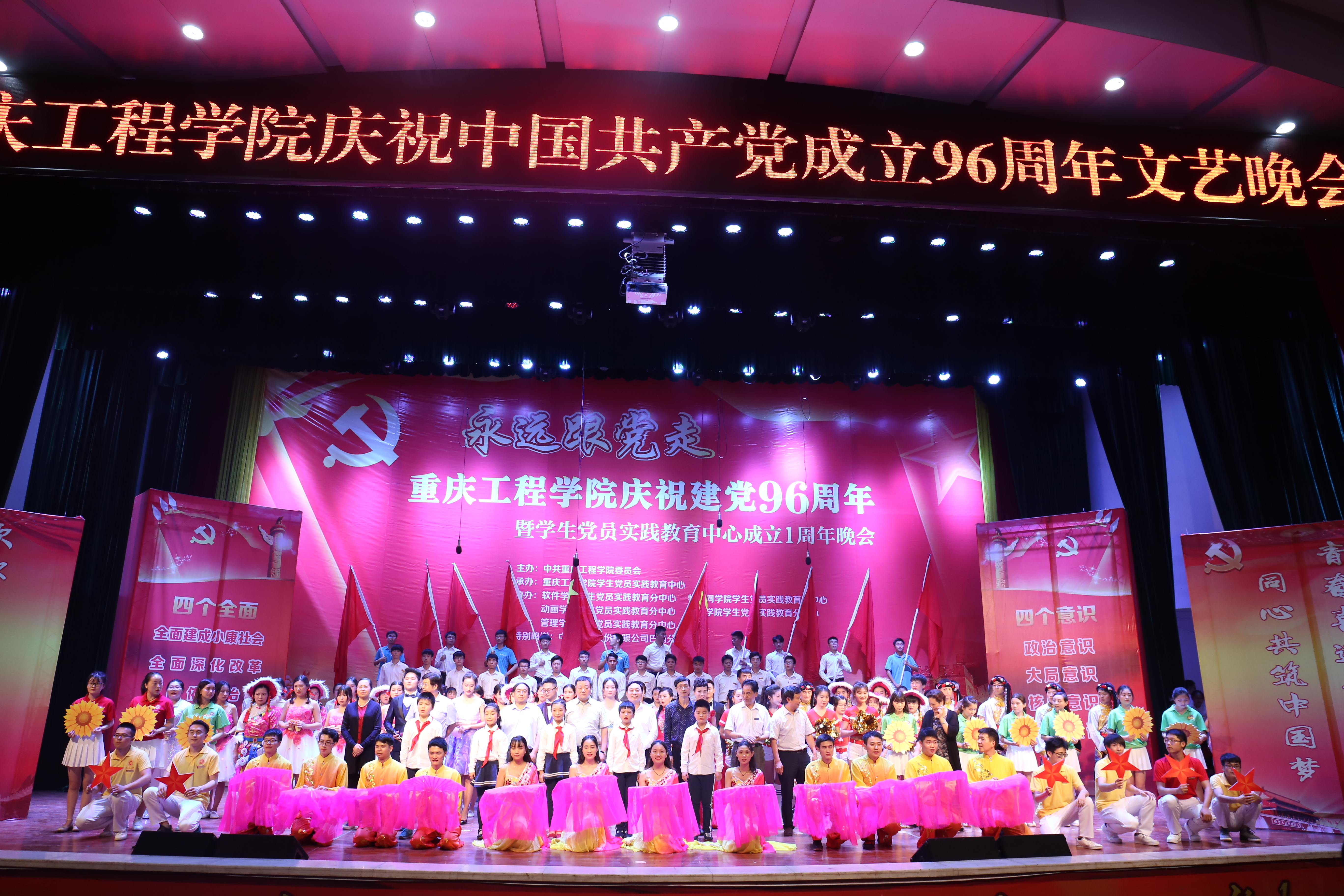 晚会共分为三个篇章,分别是《同心筑梦》、《闪光足迹》、《灿烂辉煌》,中间穿插党委领导对我校优秀党员、优秀党务工作者、优秀基层党组织的颁奖表彰仪式。