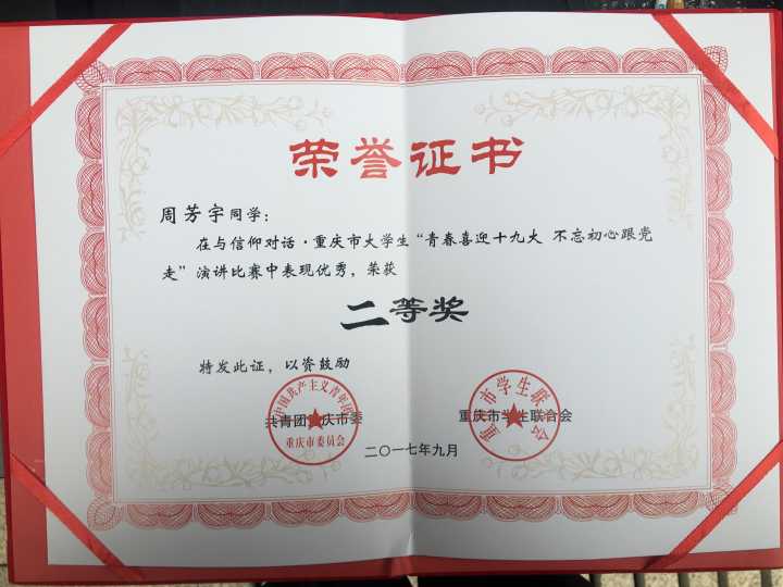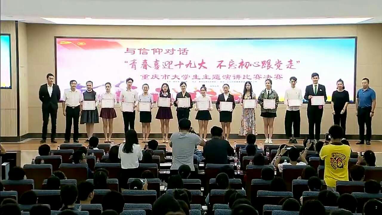 本网讯(图文/校团委 付忠鹏) 9月23日,我校土木工程与建筑学院周芳宇同学,在由共青团重庆市委主办的与信仰对话·重庆市大学生“青春喜迎十九大,不忘初心跟党走”主题演讲比赛决赛中,荣获二等奖。
