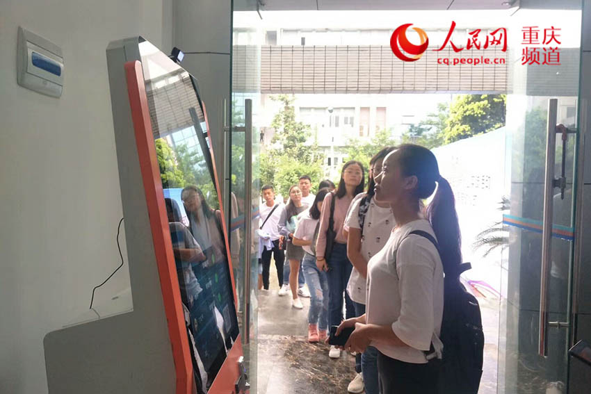 重庆工程学院的阶梯教室前,同学们在进行人脸识别