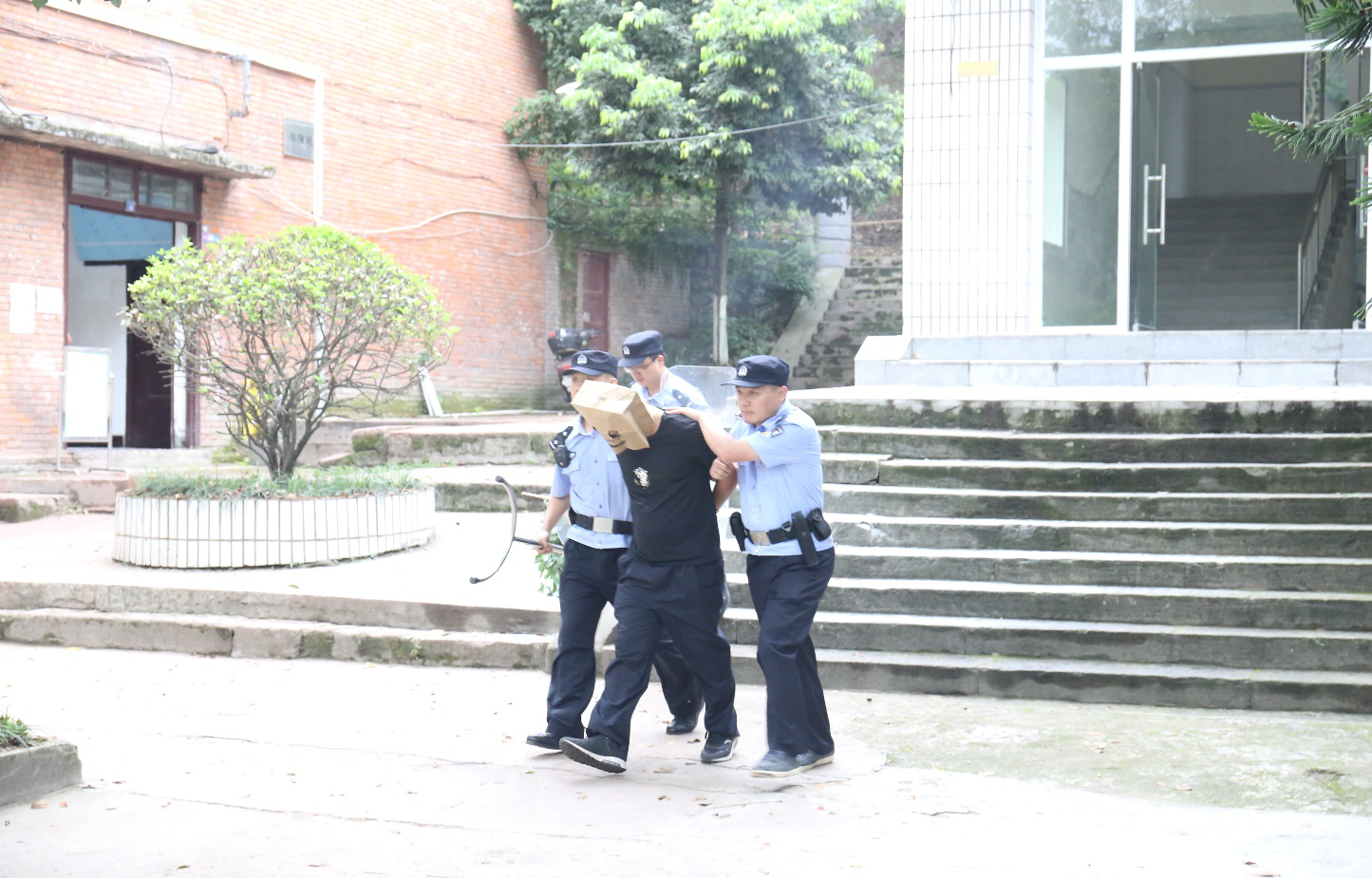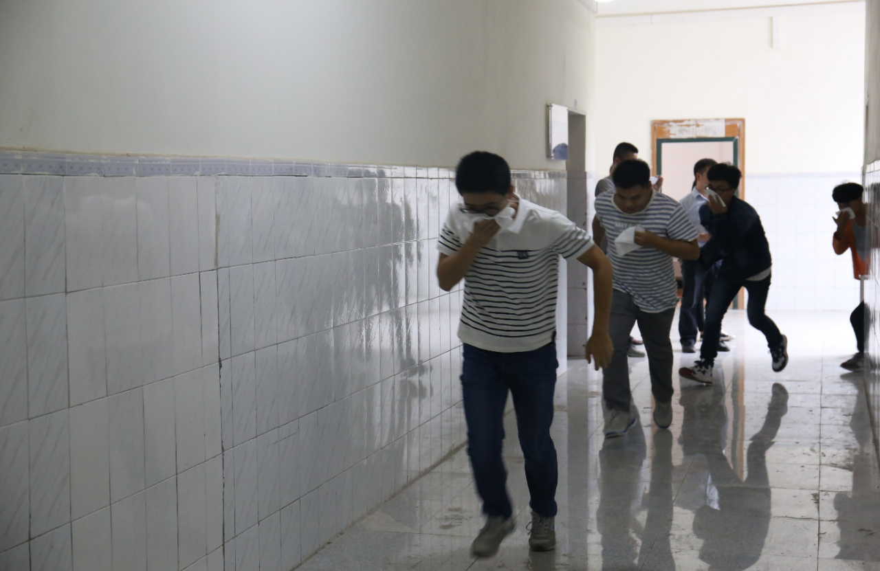 在模拟应对恐怖分子进校实施纵火等恐怖活动的实战演练中,正在教室上课的老师和学生在接到反恐警示后,在场老师立即关门关窗,组织学生紧急躲避并安抚大家情绪,听到恐怖分子被基本控制消息后,及时组织学生科学、有序撤离。同时,学校保卫处及时向公安部门报警,组织安保人员对恐怖分子进行围堵、喊话、现场灭火和警戒,最终与赶到现场的民警将“恐怖分子”成功制服。