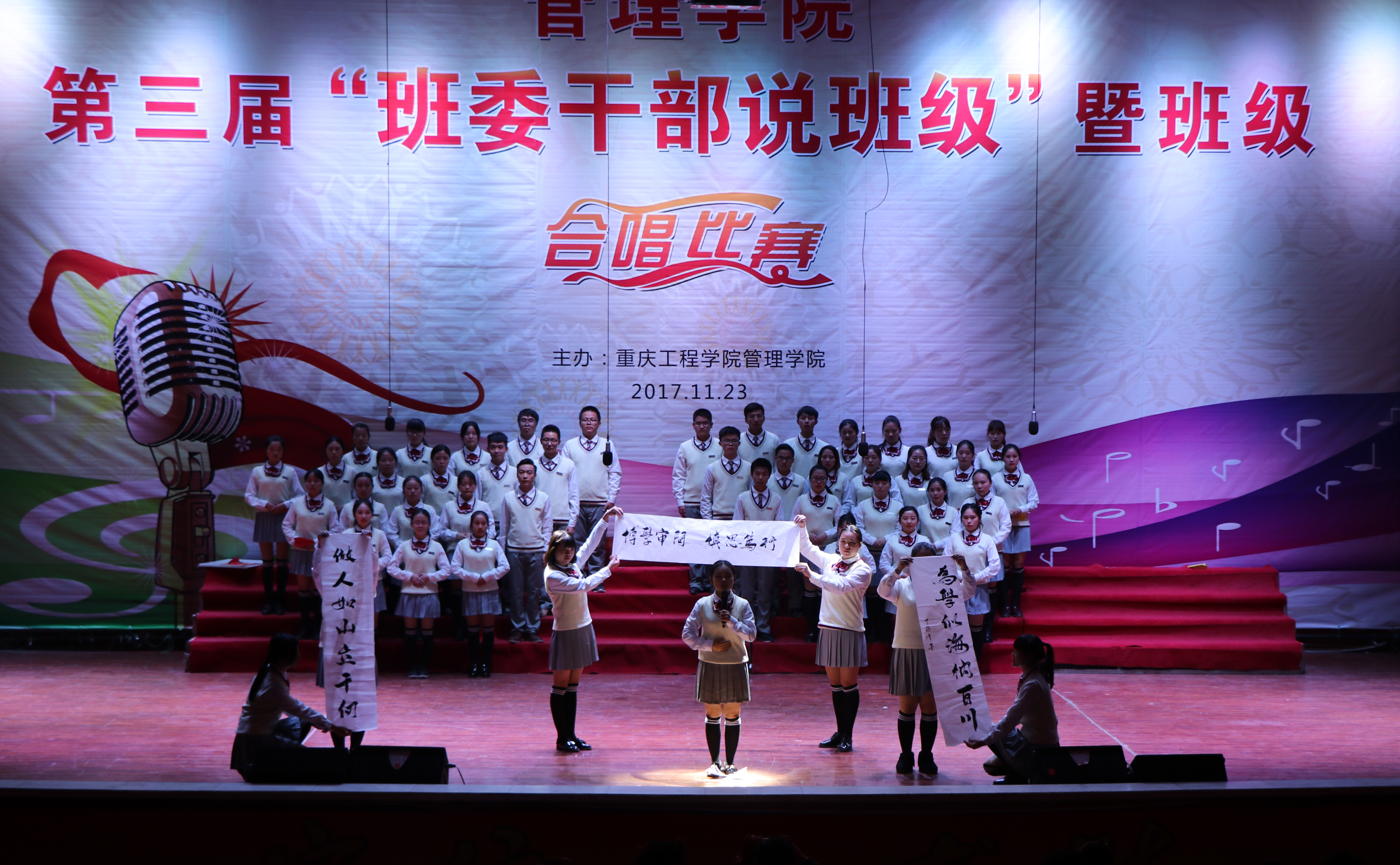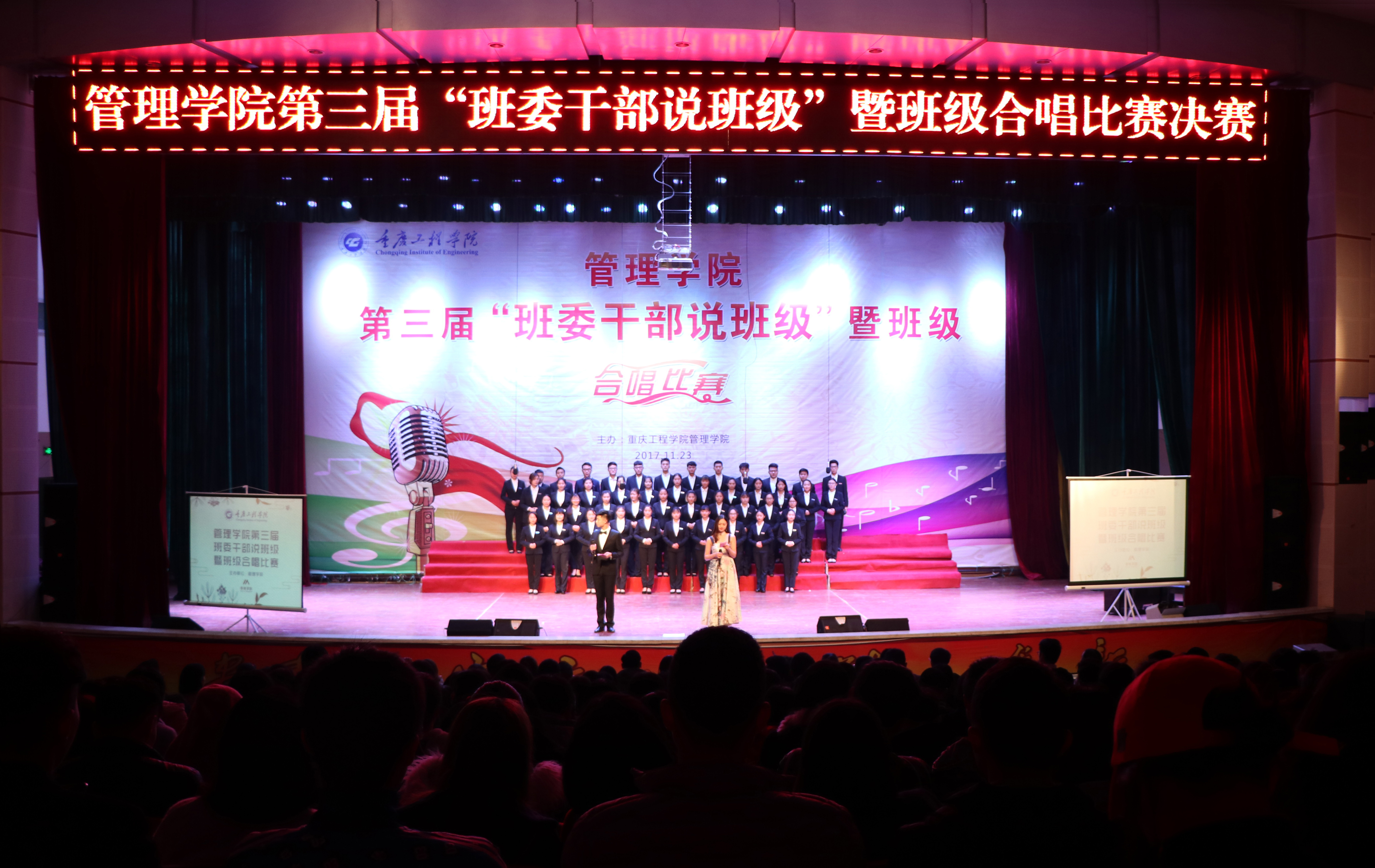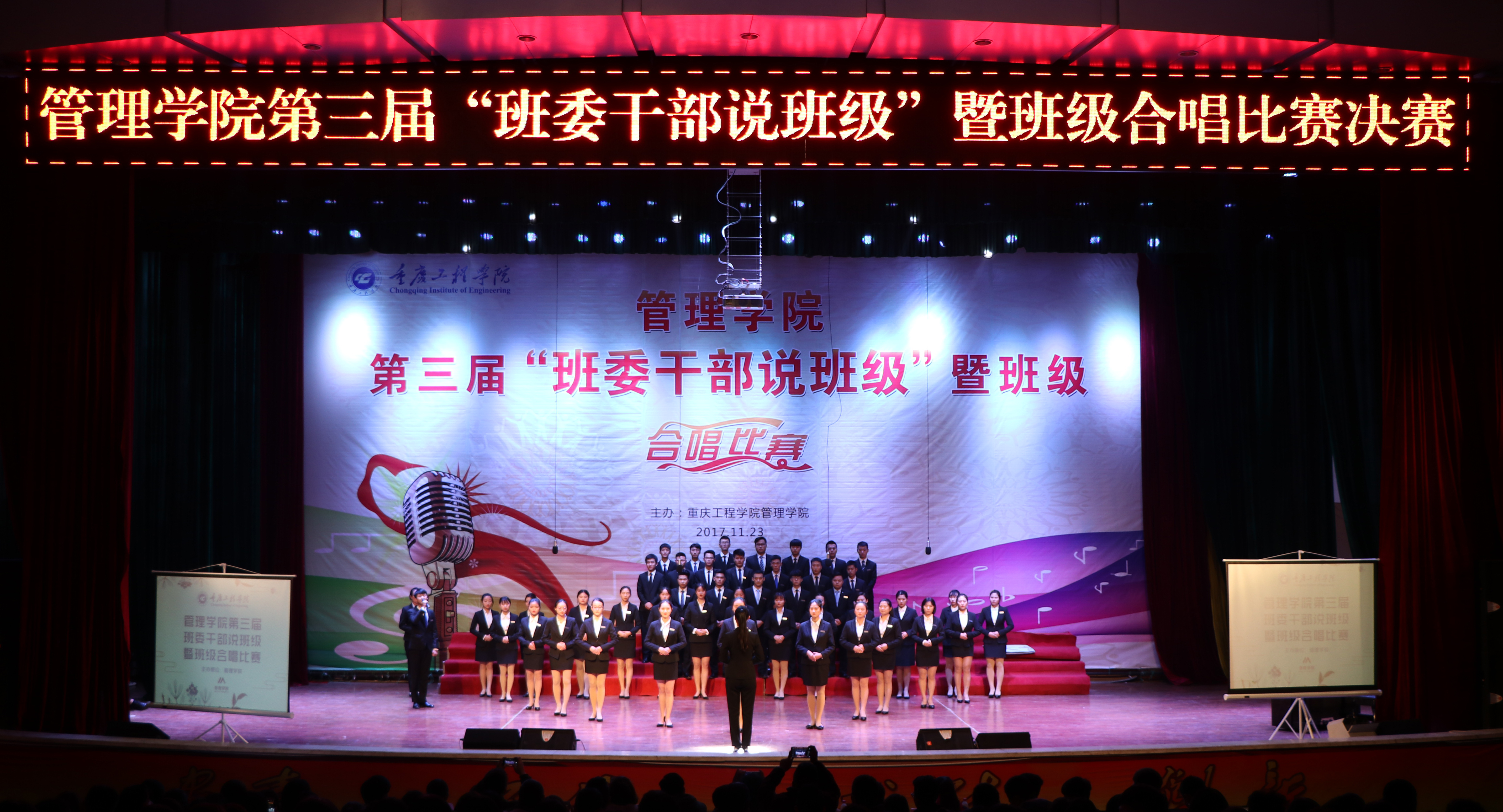 本网讯(管理学院学生工作室 付睿)为丰富在校学生的校园文化生活,打造浓郁文化氛围, 11月23日晚,管理学院在学术报告厅,举行第三届“班委干部说班级”暨班级合唱决赛。