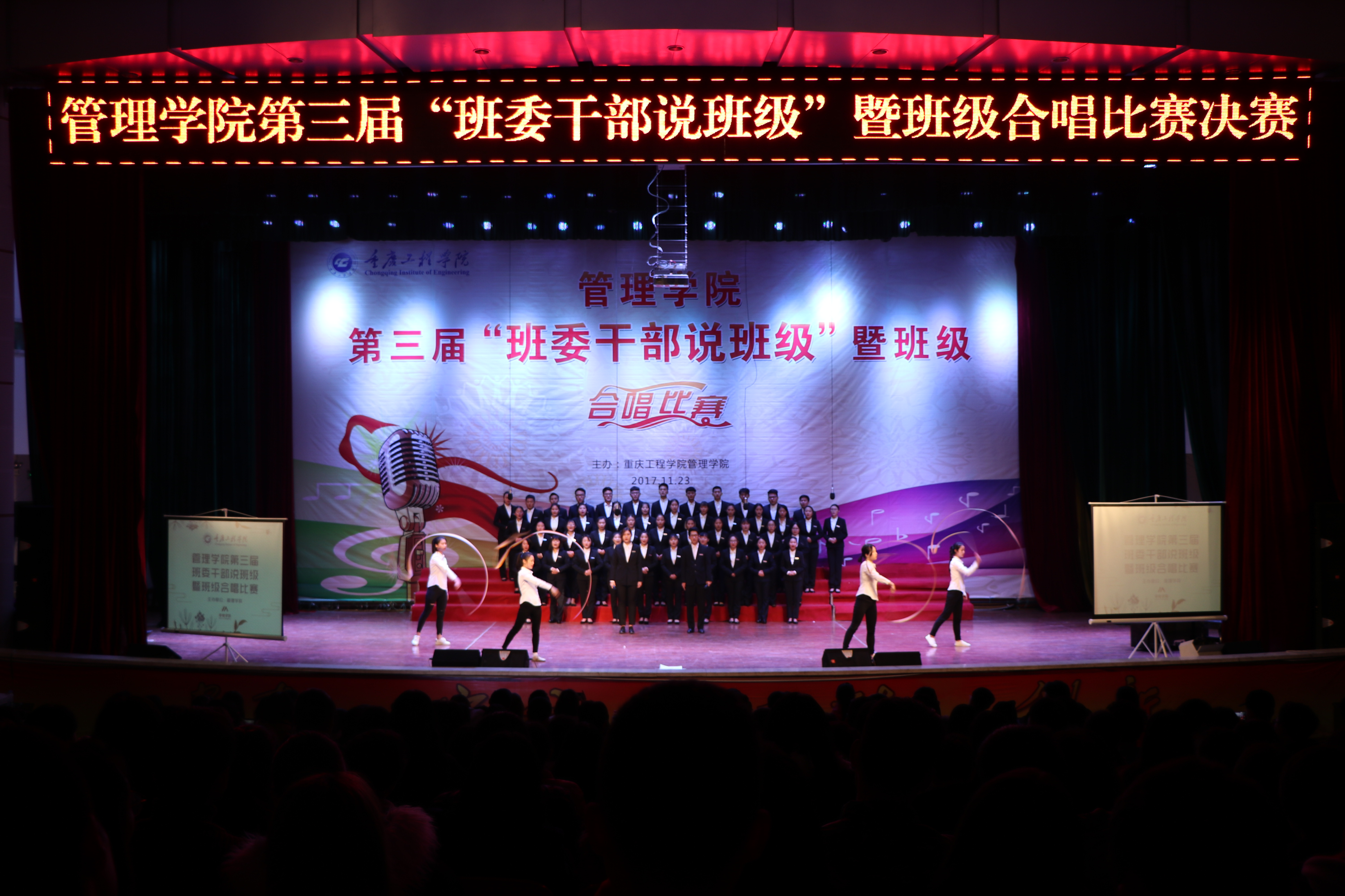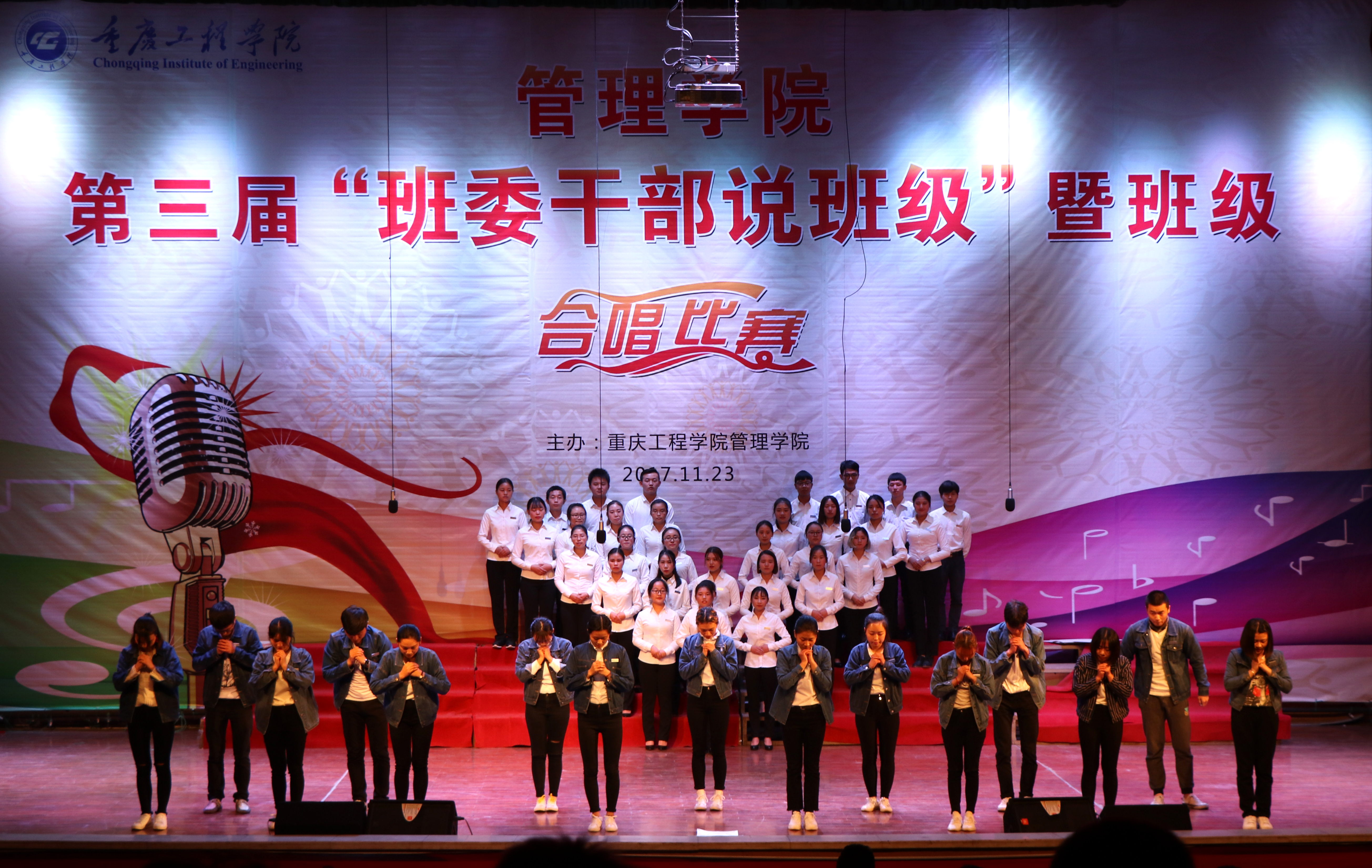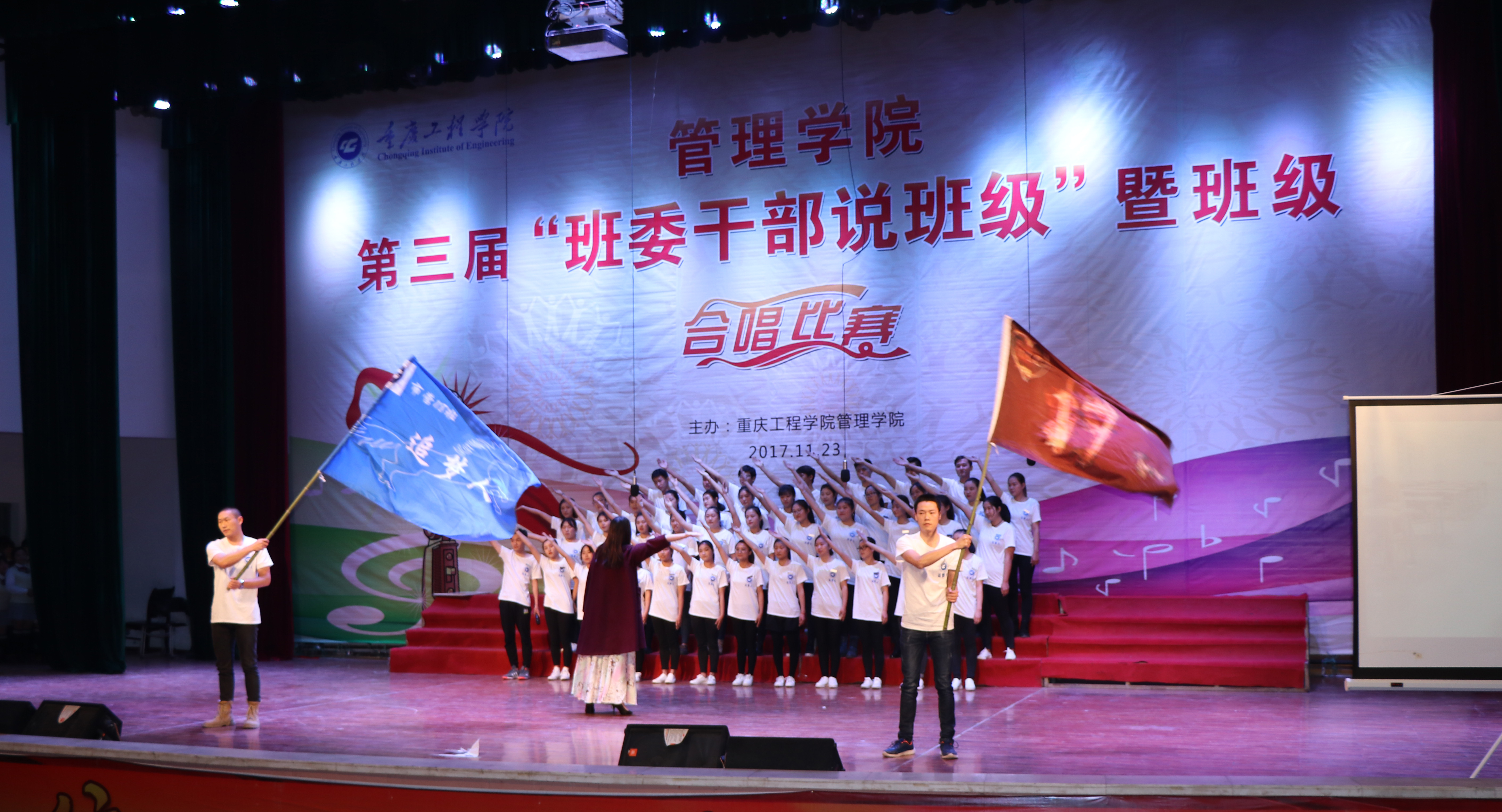 本网讯(管理学院学生工作室 付睿)为丰富在校学生的校园文化生活,打造浓郁文化氛围, 11月23日晚,管理学院在学术报告厅,举行第三届“班委干部说班级”暨班级合唱决赛。