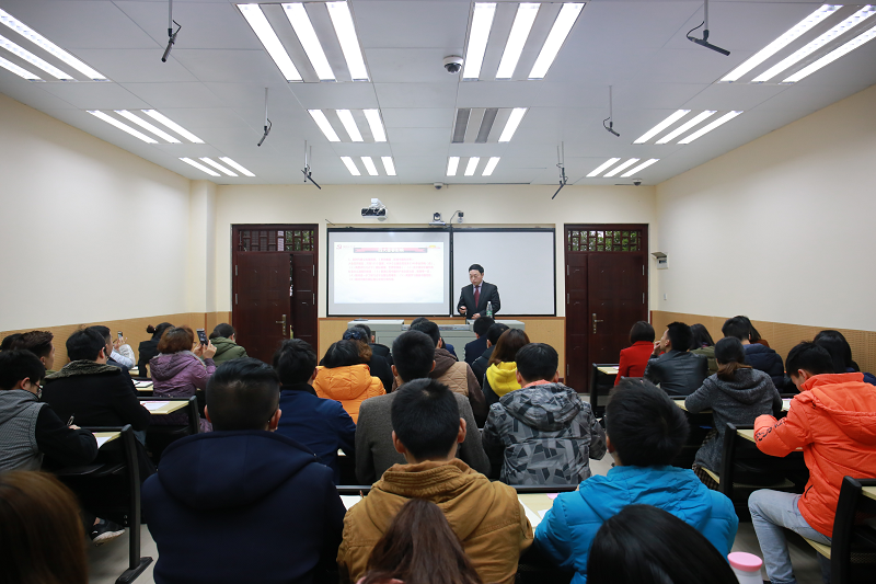 本网讯(党委宣传部)为贯彻落实重庆市委、市教育工委关于深入开展党的十九大精神进校园宣讲活动相关要求,12月6日下午,重庆市十九大精神“进校园”宣讲队成员、我校十九大精神“进校园”宣讲队队长,学校党委书记兼常务副校长张业平在南泉校区第六教学楼108视频录播室,以“拥抱新时代,担当新使命,迈向新征程”为题,向108主会场54名师生党员代表、各教室63个分会场4217名学生代表,共计4271人,作十九大精神视频宣讲。