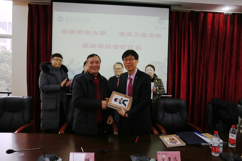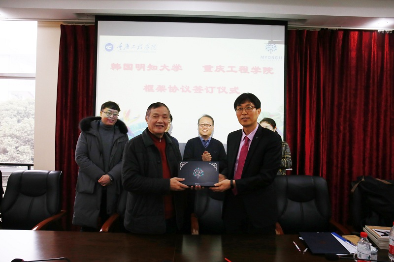 仪式上,主客双方通过面对面交流、播放短片等方式,简要介绍各自学校的教学科研、综合实力、办学特色、发展规划等情况,重庆工程学院校长唐一科教授、韩国明知大学国际交流学院金庸达院长代表各自学校,正式签署战略框架合作协议,为两校开展国际合作拟定美好蓝图,并互赠纪念品。