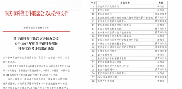 本网讯(科技处 周亮) 今年年初以来,重庆市科委会同市委宣传部、市教委、市科协、市社科联等部门,对全市121家重庆市科普基地进行2017年度科普工作考评,经过材料审核、现场考评和综合评议等环节,我校中华文化动漫研发传播中心最终喜获二等奖。