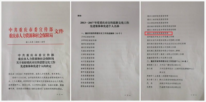 本网讯(大学生记者团曾薪文 樊慧) 寒假期间,重庆市委宣传部、市人力资源和社会保障局发出通报,表彰2013—2017年度重庆市宣传思想文化工作先进代表,重庆工程学院党委宣传部被评为“重庆市宣传思想文化工作先进集体”,全市只有10家高校单位获此殊荣。