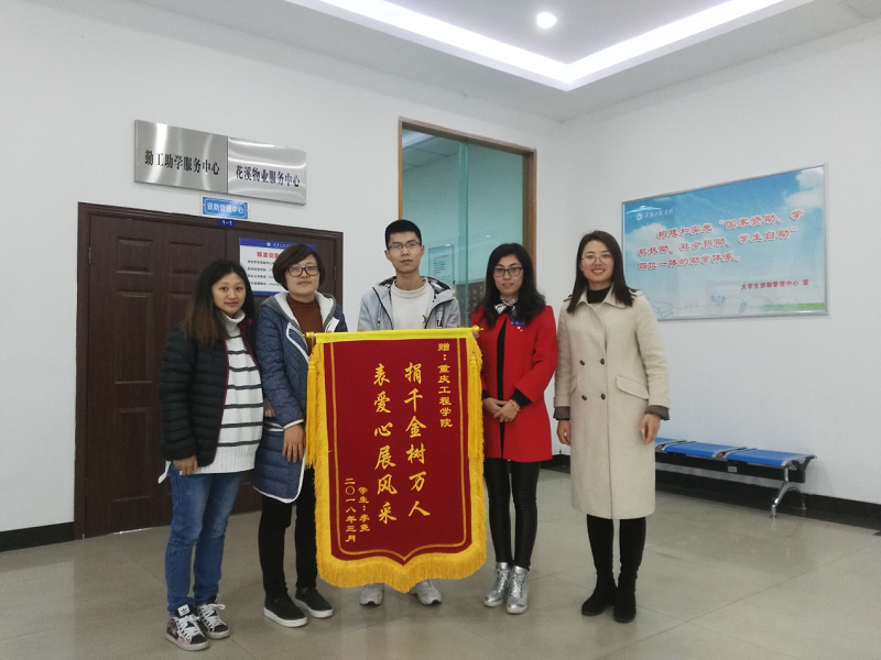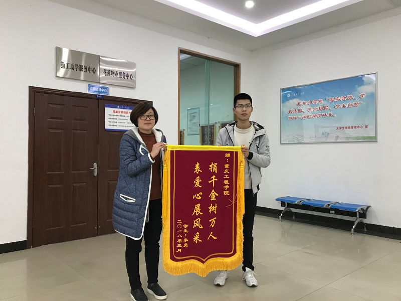 本网讯(文\土木学院崔雅斐 大学生记者团胡杰 图\学生处刘雪梅) 3月6日上午,土木学院16级工程造价学生李尧专门来到学校勤工助学服务中心,向学校赠送了一面锦旗,对在其家庭面临困难时,得到学校帮扶表示由衷的谢意,称赞重庆工程学院关键时刻“捐千金树万人 表爱心展风采”。