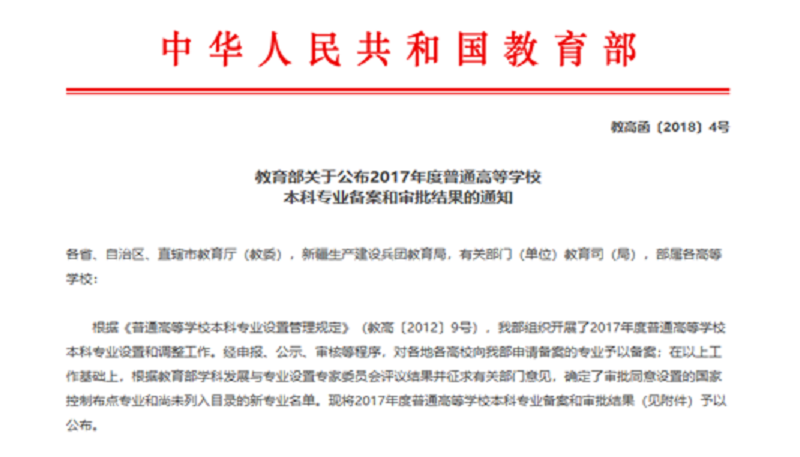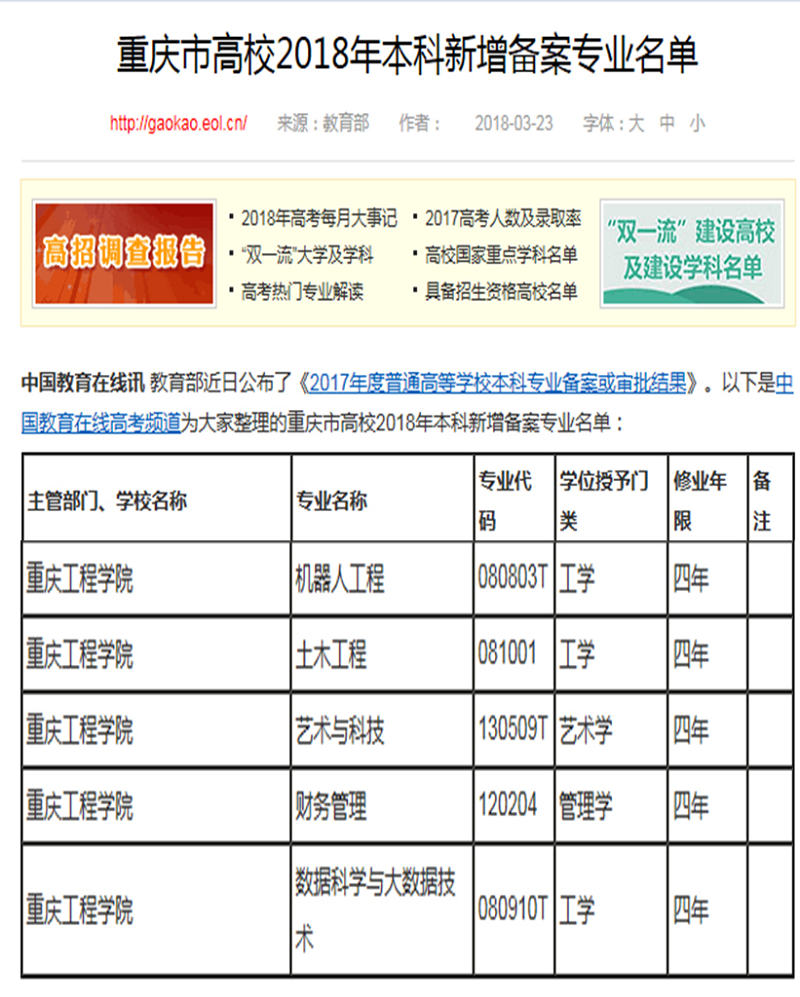 本网讯(大学生记者团/胡杰) 根据教育部3月21日发布的《教育部关于公布2017年度普通高等学校本科专业备案和审批结果的通知》,重庆工程学院新增“机器人工程”、“土木工程”、“艺术与科技”、“财务管理”、“数据科学与大数据技术”等5个与信息技术密切相关,经济社会发展急需的热门本科专业。