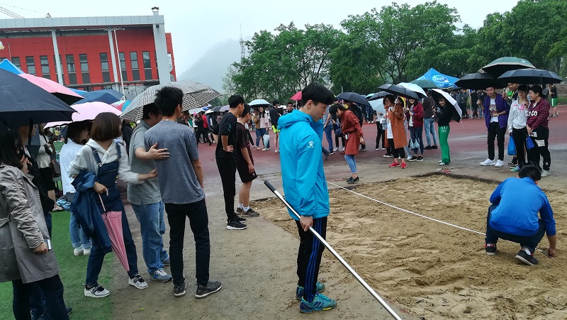 (文/郑金诺 摄/彭露娇)尽管大雨磅礴,天公不作美,4月13日9:00整,南泉校区女子组跳远预决赛依旧如期开始。一跃而起,身轻如燕,她们在蓝天下划过一道道优美弧线,赢得阵阵喝彩。让我们恭喜来自管理学院的秦秀以4.10米的好成绩获得第一名,同样恭喜来自动画学院的吕双杉,动画学院段明霞的分别获得第二名和第三名。