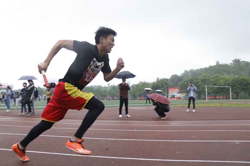 (文/黄进秀 摄/林新凯)淅淅沥沥的小雨也挡不住运动健儿们的步伐,13日下午14时男子4X100米预决赛在众人的期待下按时展开,一声枪响,运动员们奋力向前拼搏,像射出去的箭一般,最后在队员们默契配合下管理学院的王小龙、孔俊杰、张扬、吴吉庆获得4X100米男子组冠军,动画学院和物联网学院分别获得二三名。