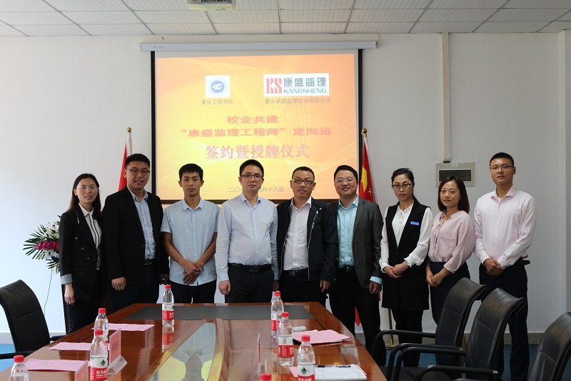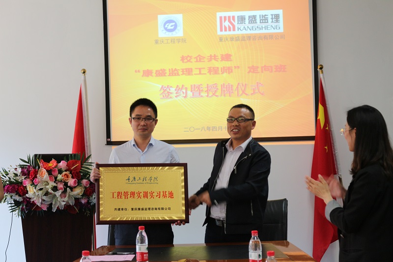 会上,康盛公司总经理刘书红、土木学院执行院长雷江,就共建“康生监理工程师”定向班等签订合作协议,并相互授牌。