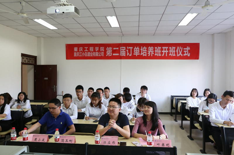 执行院长简玉刚、重庆江小白酒业有限公司组织中心副总经理汪应伟等学院和公司负责人,订单班23名同学参加开班仪式。